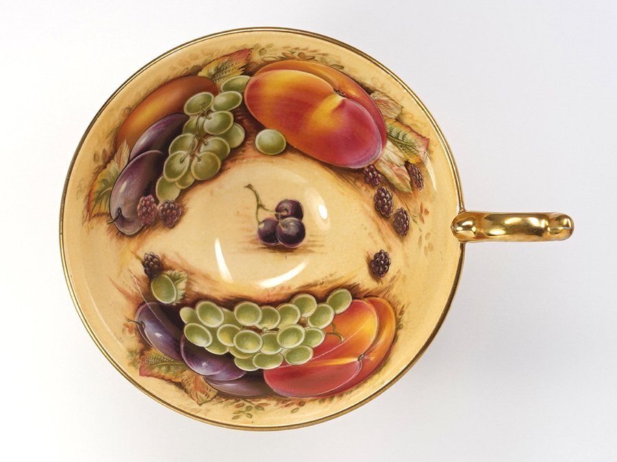 瑞々しいフルーツと金彩が美しい「オーチャードゴールド」シリーズは、18世紀エインズレイを代表するデザイン「スティル・ライフ・フルーツ」をモチーフとし、1980年にステファン・バーズレイによって誕生しました。