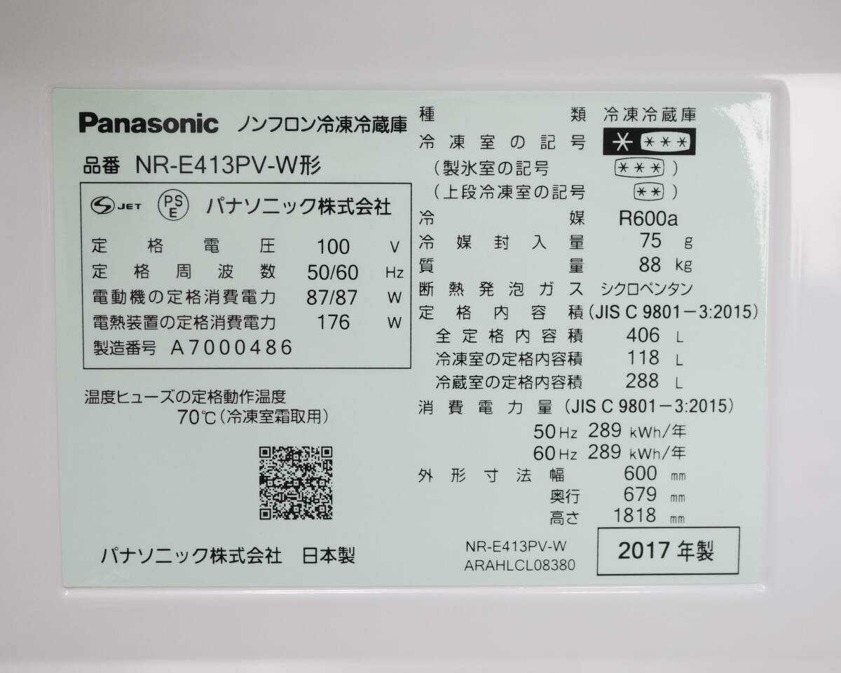 Product name: 東ハ:【パナソニック】5ドア 冷凍冷蔵庫 406L NR-E413PV-W 日本製 右開きタイプ 幅60㎝ ナノイー搭載 微凍結パーシャル ★送料無料★