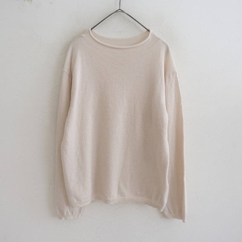 MARGARET HOWELLのカシミヤニットプルオーバーです。カラーはピンクベージュで、柔らかな薄手のカシミヤニット地です。プルオーバータイプで着脱でき、ネックはロール仕様で、袖口・裾はリブ編みです。