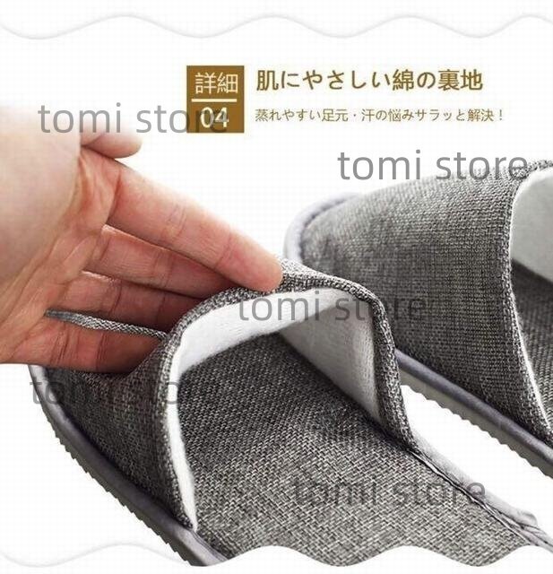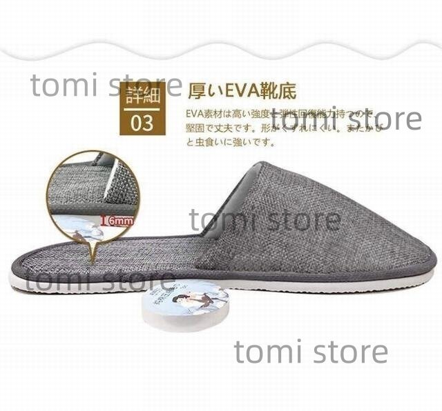 【サイズ仕様】 全長約:28.5cm 男女兼用 【天然素材&防菌防臭】 本体:綿麻 底面:EVA べたつかず素足で気持ち良く履いていただけます。通気性良くて、防菌防臭、全体的に足の輪郭と合わせます。実用性とデザインに優れた柔らかいスリッパです。