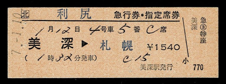 JR北海道 急行 利尻 急行券+指定席券 閑散期色 美深から札幌 ホチキス穴あり平成7年
