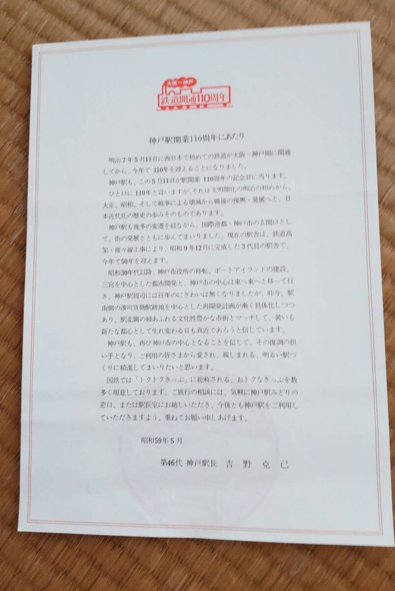 用紙は「神戸駅開業110周年 神戸駅長の挨拶文パンフレット」で、その裏面の下部に押印しています。