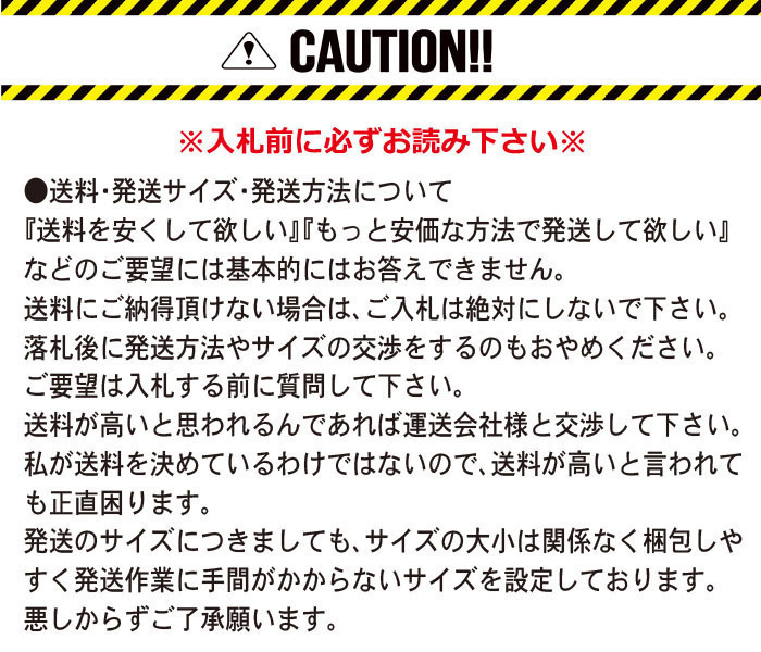 入札後・落札後に発送方法や発送サイズの変更を希望したり、交渉するのはおやめください。基本的にこの『発送方法・送料』の欄に記載している内容を、入札者様・落札者様の希望で変更することはございません。ご希望がありましたら、必ずご入札前に質問にてお問い合わせ下さいますようお願いいたします。