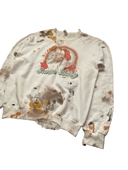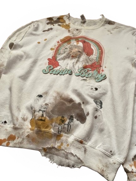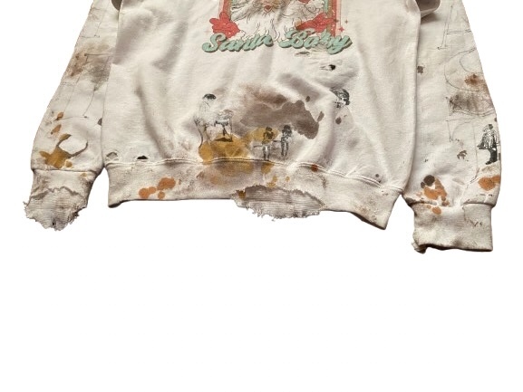 サンタのイラストが特徴のカジュアルなトレーナー。汚れやダメージがあるユニークなデザイン。