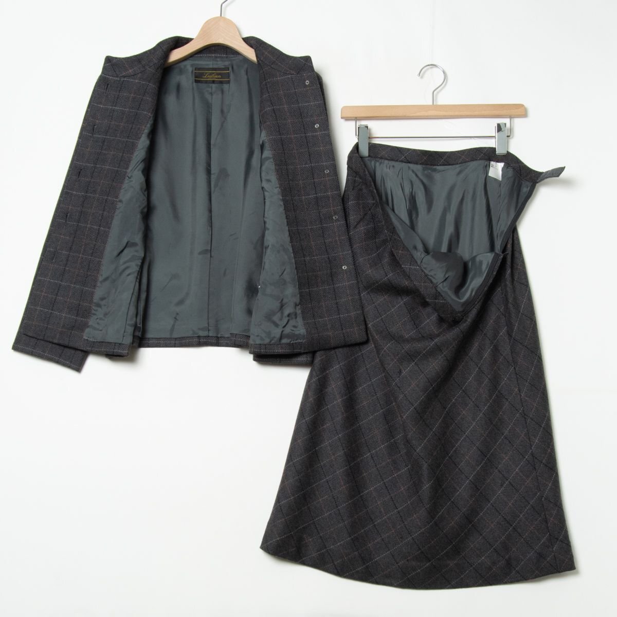 【1円スタート】Leilian レリアン チェック柄スーツ 13+ スタンドカラージャケット 肩パッド ロングスカート 毛100% 秋冬 灰色 日本製