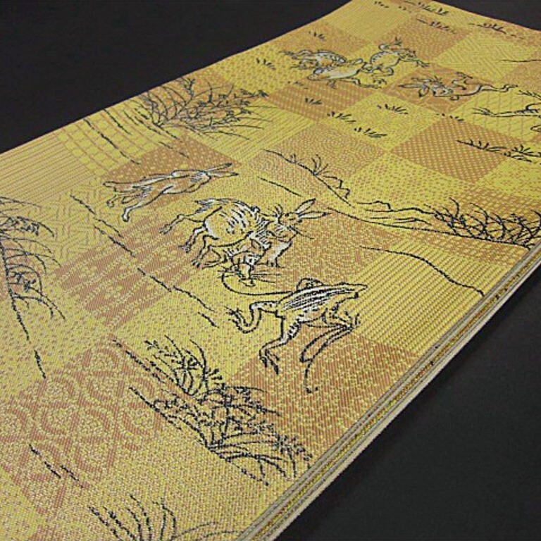 新品未仕立  西陣織全通袋帯 紹把織 伊勢型百選 鳥獣人物戯画です。鳥獣戯画といえば兎や蛙、猿たちが人間のように遊んで笑っている様子が朗らかな有名な絵図。背景には伊勢型紙の様々な柄が市松に配置され、鳥獣戯画の世界感をさらに趣き深く彩っています。伊勢型紙の細かくも多様な紋様が動物たちが織りなす物語とあいまって楽しく複雑な世界に連れて行ってくれる、そんな作品となりました。帯結びをする時に柄位置を考えなくてもサッと結べる、全通柄。結び易い紹把織で丁寧に織上げてあります。織り上がったばかりの帯です。