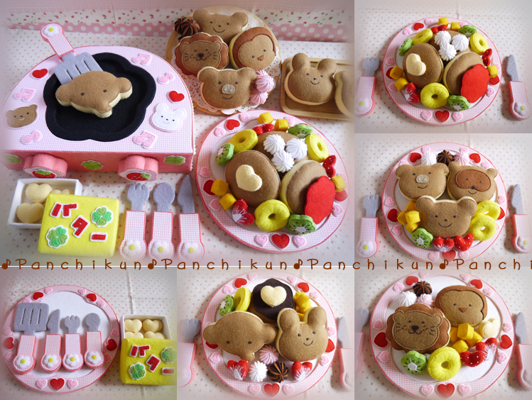 ♪ホットプレート&たこ焼きプレート(ホットプレートの反対側がたこ焼きプレートになります)、お皿、スプーン、フォーク、ナイフ、フライ返し、たこ焼きピック、バターケース、バター、マヨネーズ、ソース、たこ焼き皿、ホットケーキ(丸、ペンギン、ぞう、ぶた、ライオン、うさぎ、くま、たぬき)、たこ焼き、クリーム、ハートいちご、お花キウイ、マンゴー、ミニパイン、ソースが作れます。