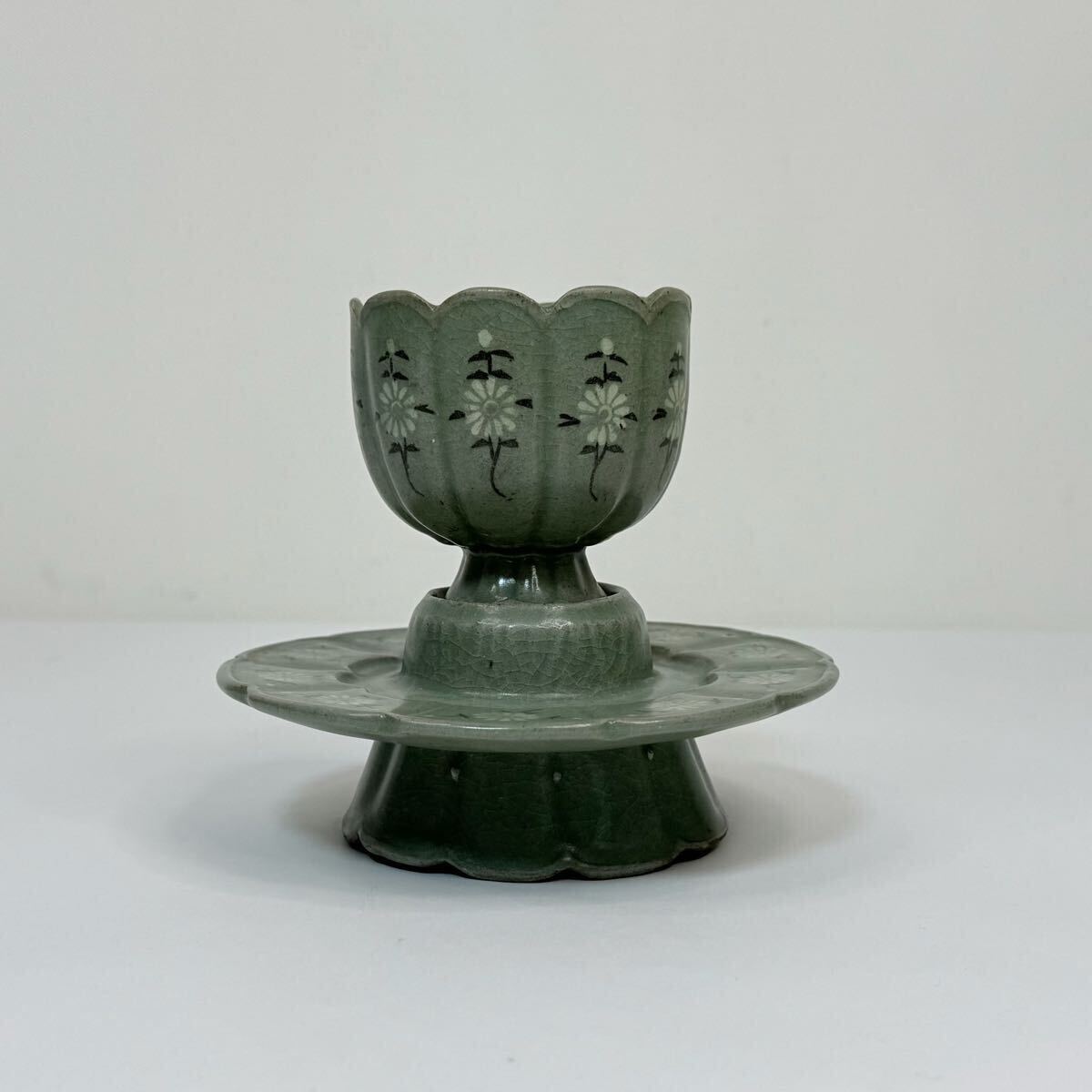 RR-古美術 韓国 李朝 高麗 青磁 時代物 青磁 盃 杯 茶托 花草図 茶道具 花口 共箱付 唐物 陶磁器 骨董品 幅14cm 高さ12.8cm