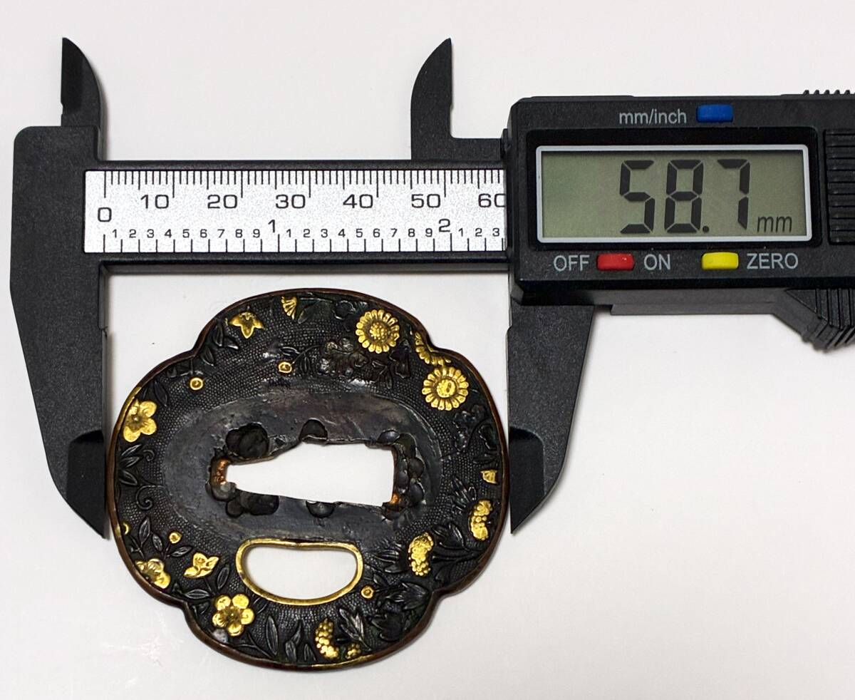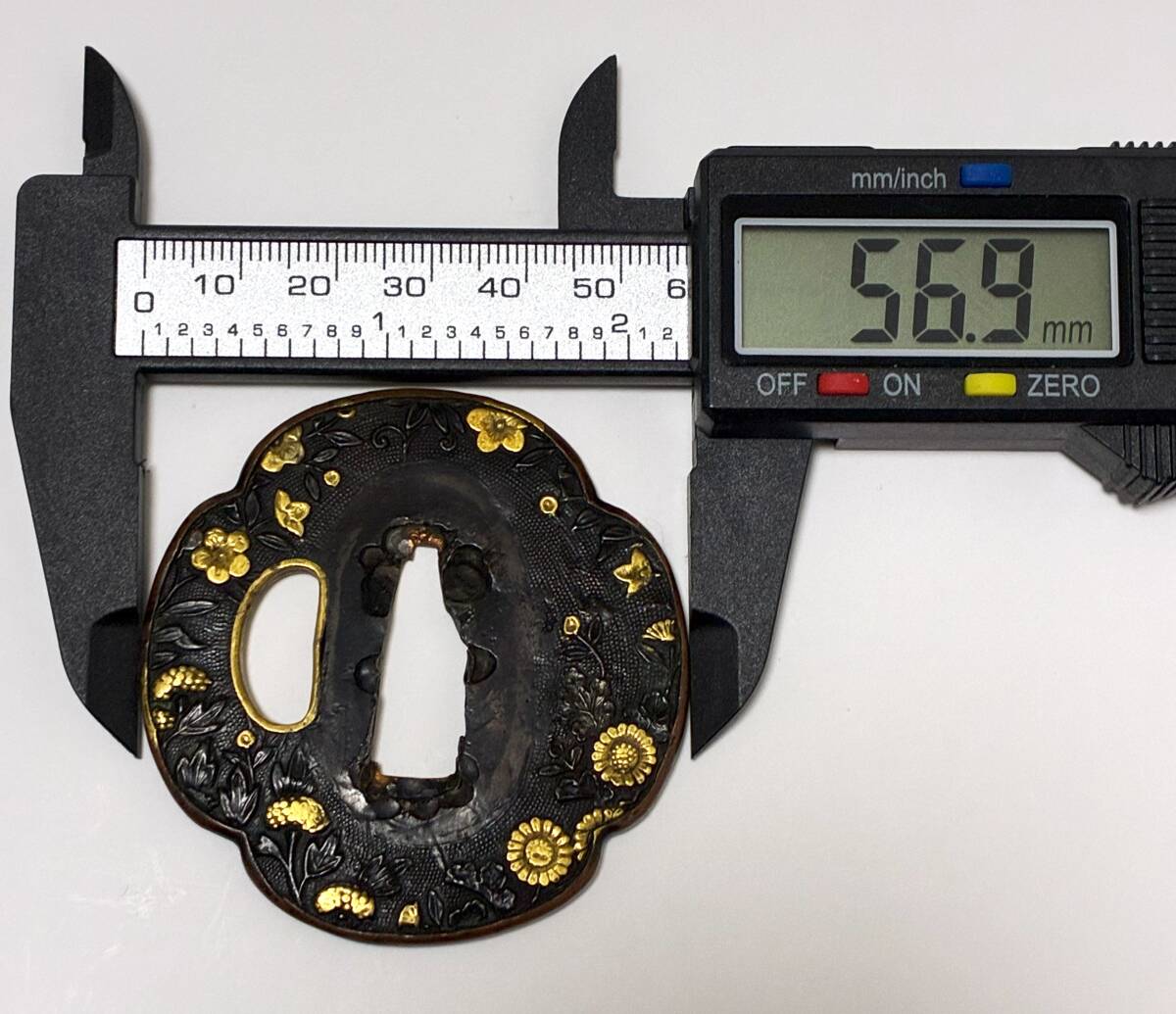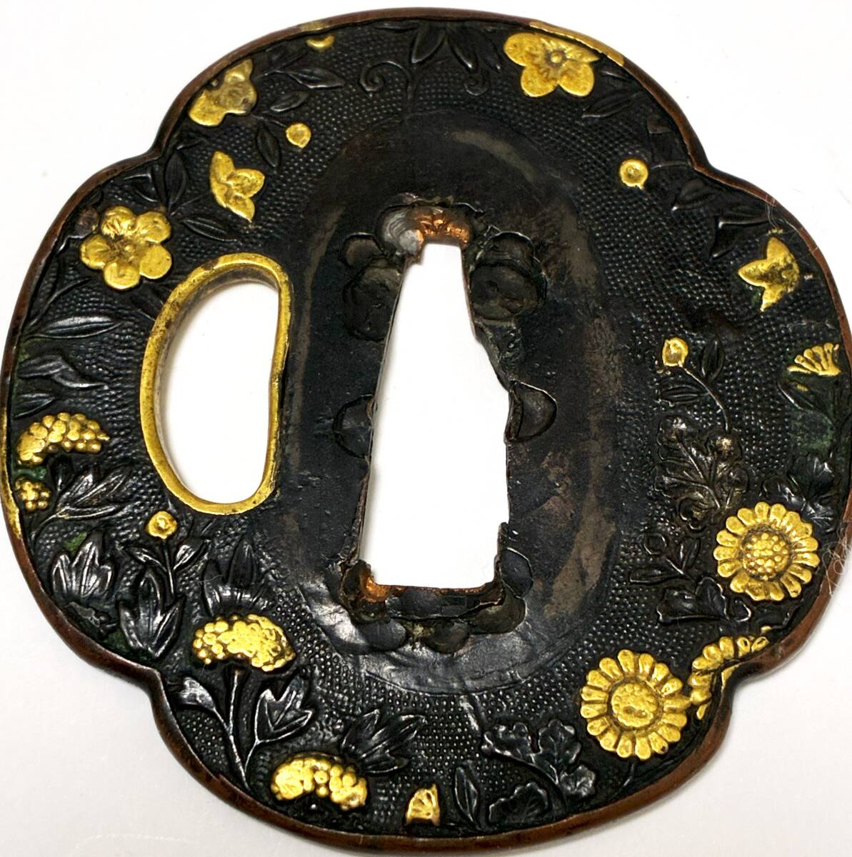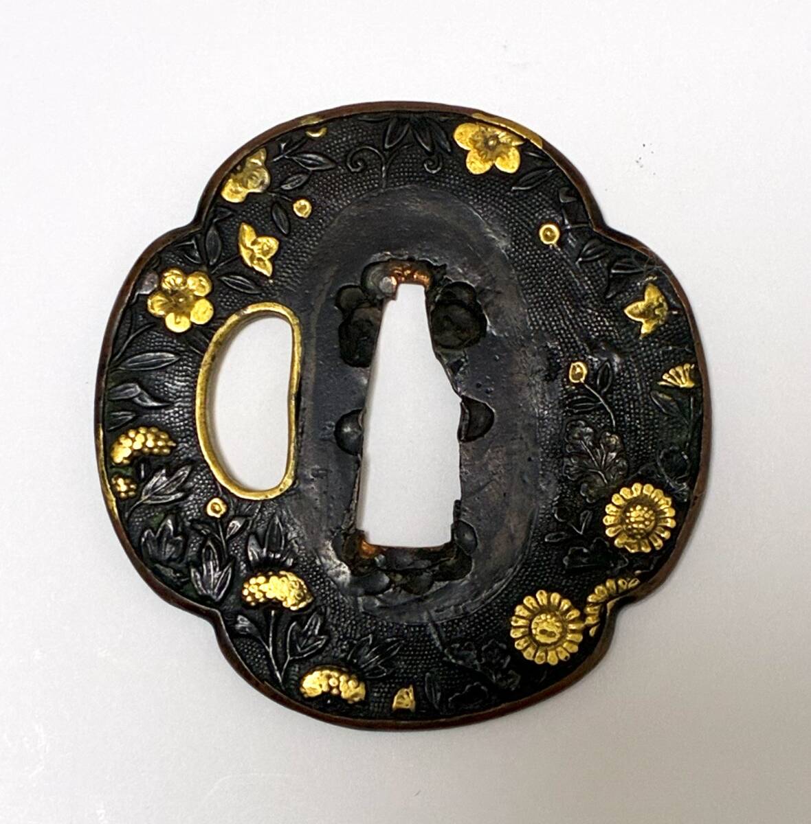 鍔 刀剣美術/無銘/金銀象嵌/丸形鍔/花図/骨董/日本刀/刀装具/縁頭/目貫/武具/刀剣/拵