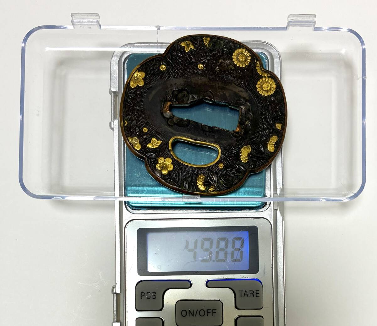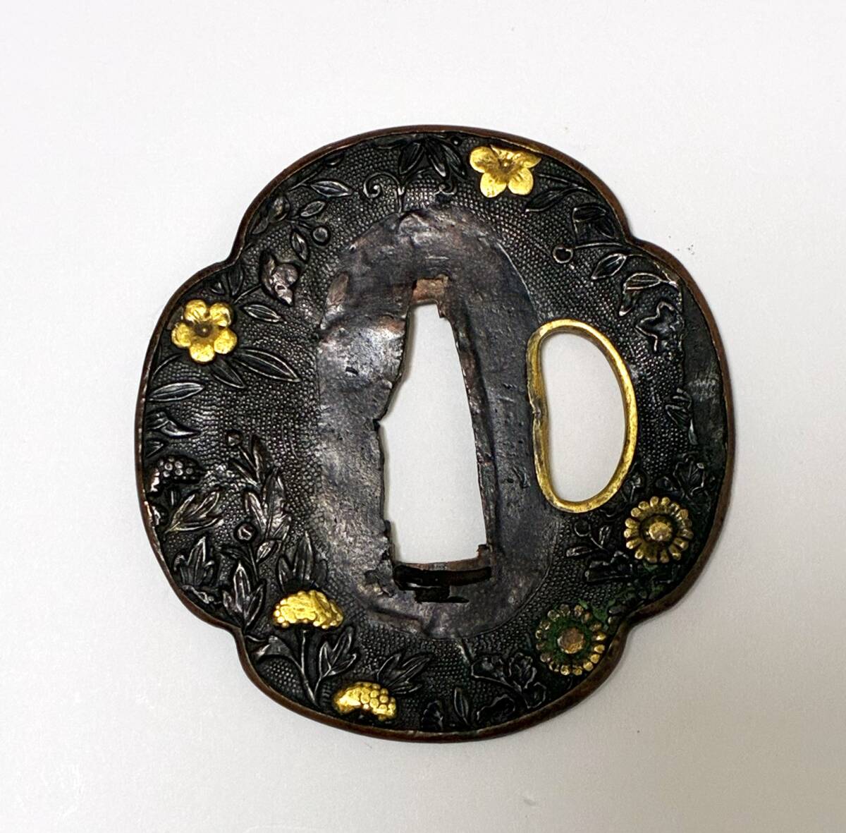 Product name: 鍔 刀剣美術/無銘/金銀象嵌/丸形鍔/花図/骨董/日本刀/刀装具/縁頭/目貫/武具/刀剣/拵