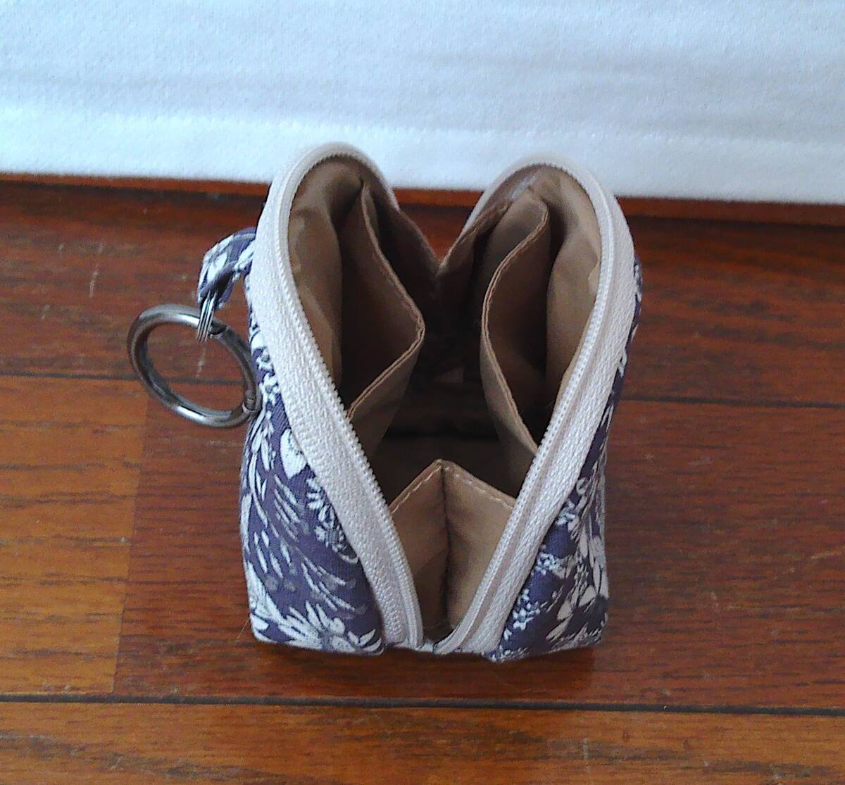 ★カラビナ付きミニポーチ★紺系グレー白花葉っぱ