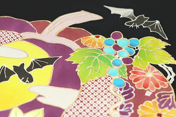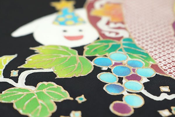 お太鼓や胴部分には、黄色、緑色、水色、深紫色、白色、赤色などの鮮やかでカラフルなお色でカボチャやお化け、葡萄など、ハロウィンの楽しい模様が染められております。