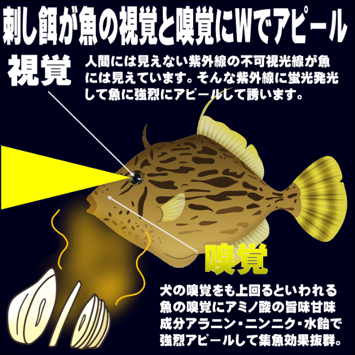 激臭・ケイムラ蛍光発光でカワハギを寄せる