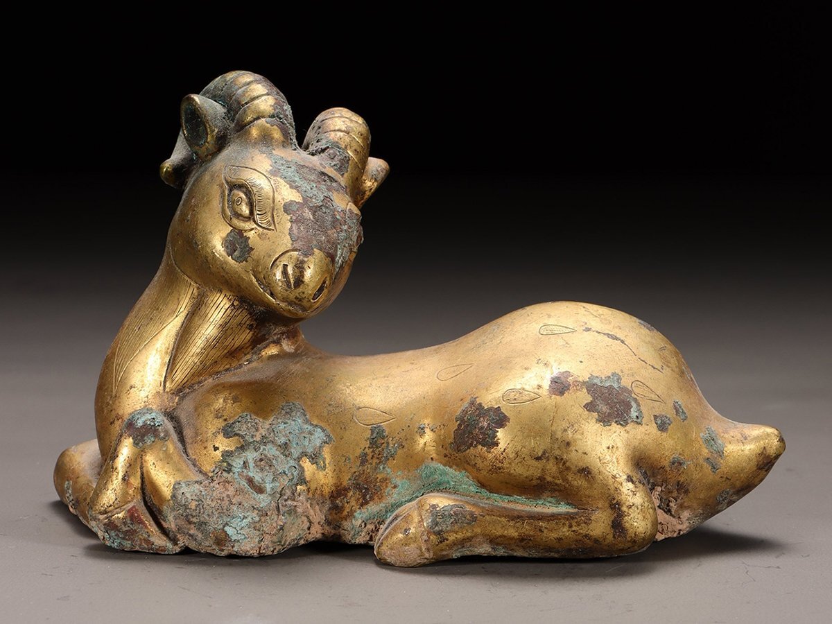 【安】唐時代 銅胎施金 臥羊鎮紙 極細工 古置物 古擺件 中国古美術 古美味 時代物 古董品 296
