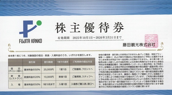 藤田観光株主優待券9枚売り。期限2026年3月31日。