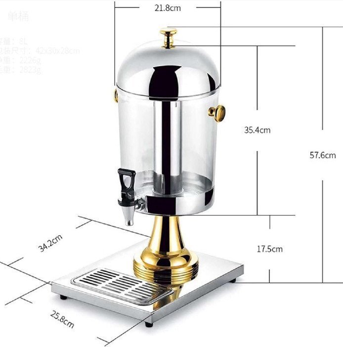 【製品仕様】ジュースディスペンサーシングルバレルのサイズは25.8x34.2x57.6cm、容量は8Lです。