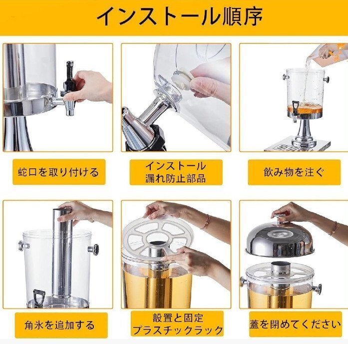 【製品素材】飲料ディスペンサー高品質のステンレス鋼製。 頑丈で耐久性があり、長寿命。 ジュースバケツは高品質のPC素材で作られており、カップ本体はガラスのように透明で、厚くて落ちにくいです。 内部には円筒状の氷管が設置されており、氷と水が直接触れないようになっています。
