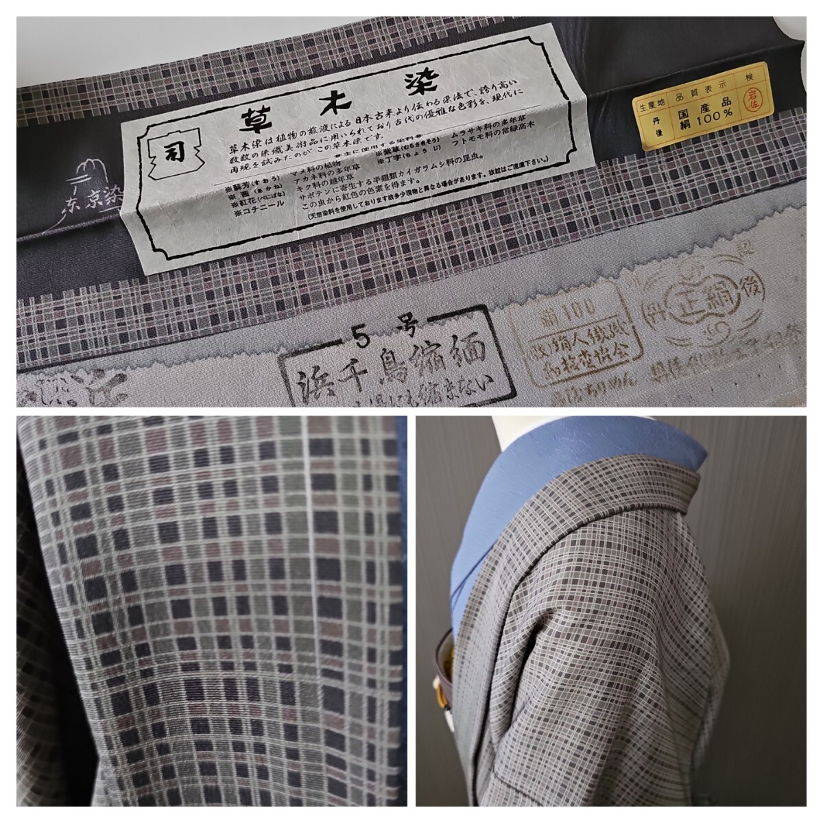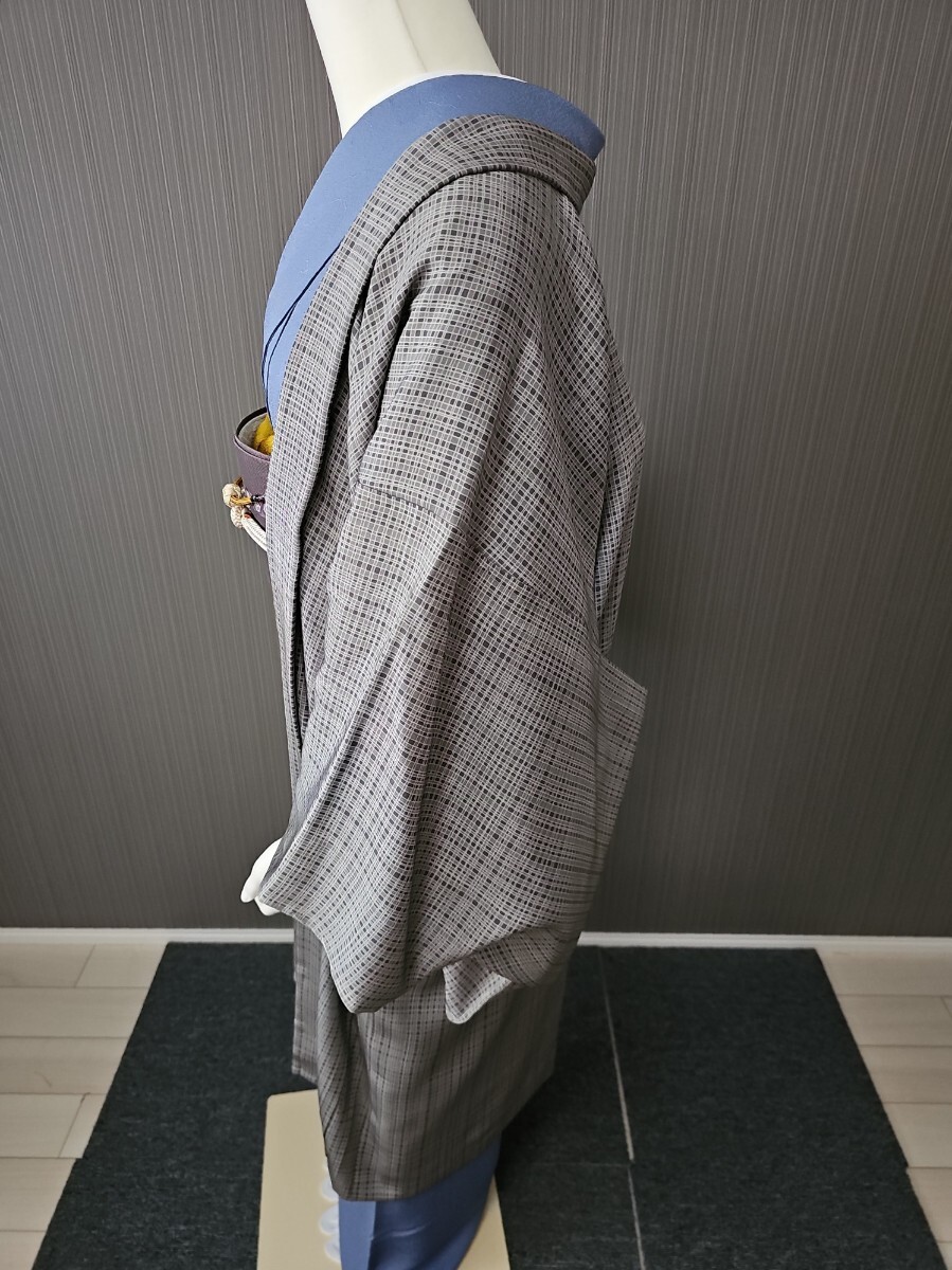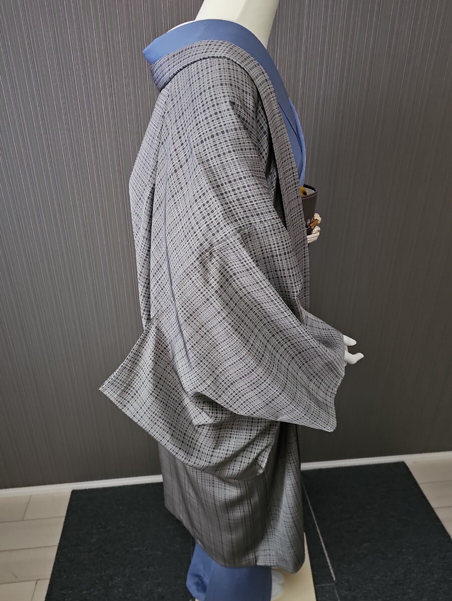 ★滑かな上質丹後ちりめん生地、草木染めによる利休鼠系、東京染の小粋な格子文様が美しいモダンさに満ちた上等なお召し物でございます。