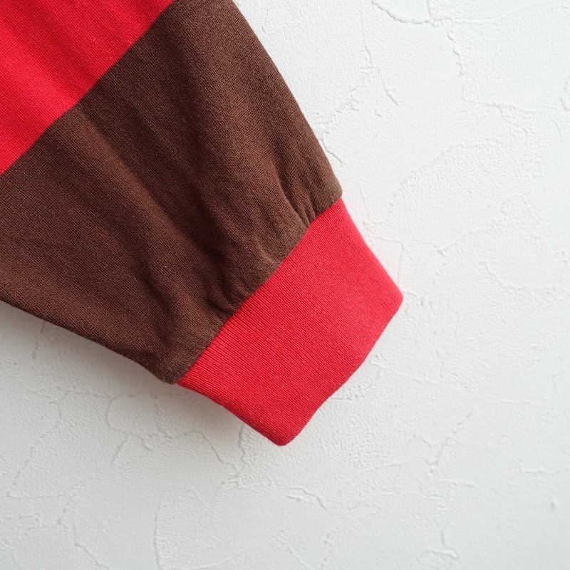THE SHINZONEのワイドラガーシャツです。カラーはレッド×ココアブラウンです。しっかりと目の詰まった、柔らかな肉厚コットンカットソー素材を使用。比翼ボタン仕様のポロカラー。かなり身幅の広いワイドなデザインで、ややショートの着丈です。脇内側には丸いパッチがあしらわれております。ポケットはございません。