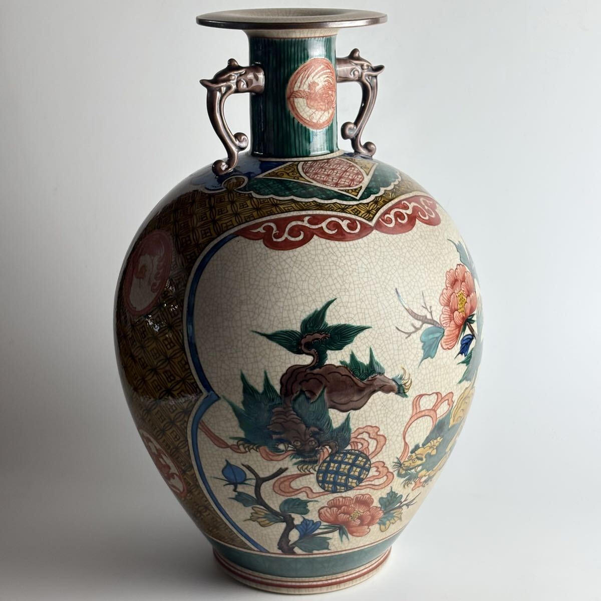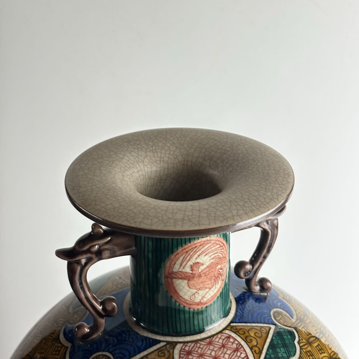 Product name: 九谷 九谷焼 楽鳥 花瓶 共箱 双耳花瓶 陶器 花器 花入 壺 飾壺 陶瓷器 華道具 CO-26