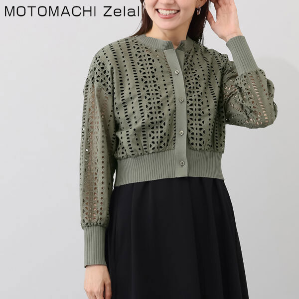 元町ゼラール コットン100% 総カットワークレース クロップトカーディガン M オリーブ