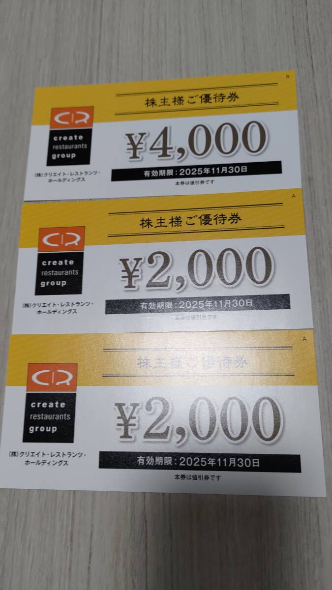 【送料込み】クリエイト・レストランツ・ホールディングス株主優待券8000円分 ※有効期限:2025年11月30日まで