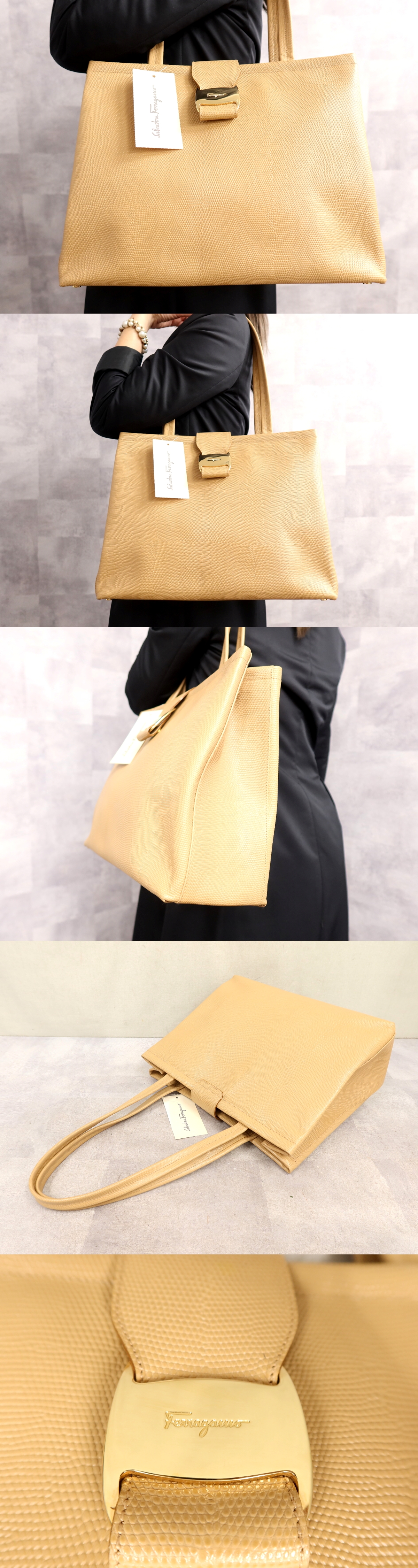 Store ●超美品●Salvatore Ferragamo フェラガモ●ヴァラ●リザード 型押し レザー●ショルダー バッグ●ベージュ●ゴールド金具●A4●Js66006