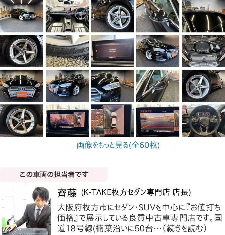 K-TAKE枚方店は国産セダン・SUV・ステーションワゴンを中心に取り扱いしております。趣向性の高い車種になりますので、専門知識を持ったスタッフにてご案内させて頂きます。コーティングやカスタム等はもちろん、任意保険、オートローンまで安心のカーライフをお約束致します。整備、保証などのアフターサービスも当店ですべて行えますのでご安心ください。当社は全国のオークション会場、約160カ所と業務提携を結んでおります。全国60000台以上の中古車を当店でご商談、ご契約、ご納車可能です!