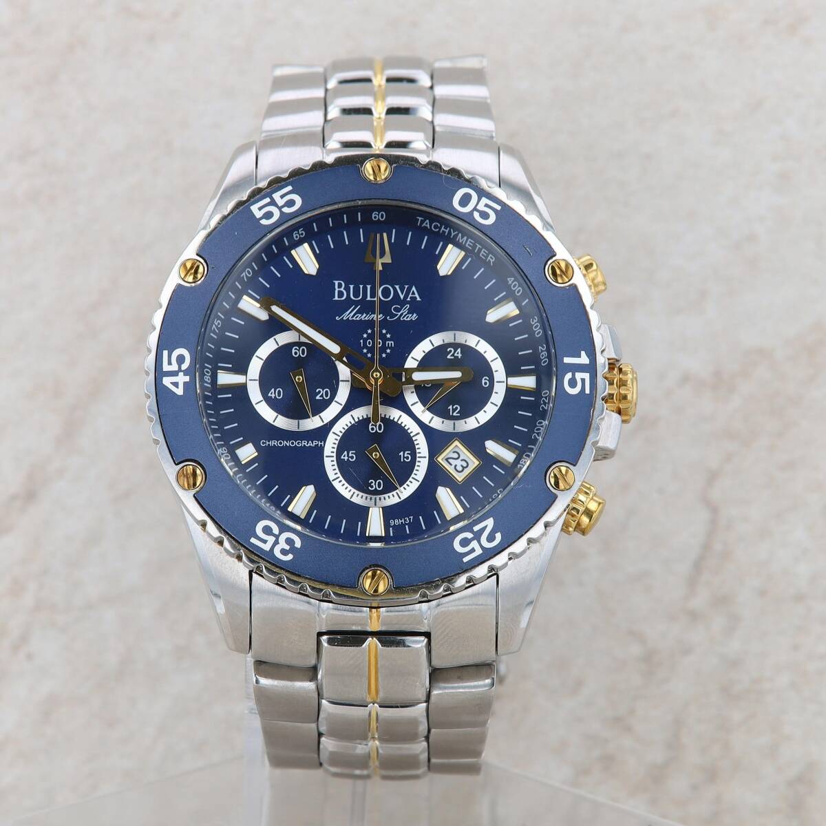 ☆彡 BULOVA プローバ Marine Star 98B400 クロノグラフ タキメーター 100m防水 精悍なブルーダイアル 日本未販売の為入手困難