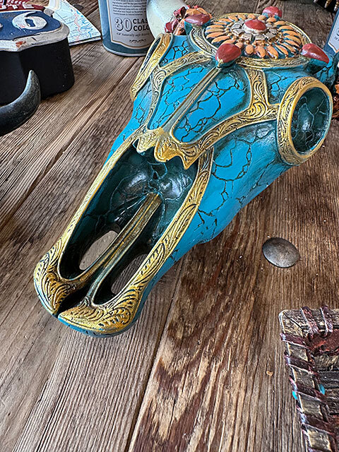 スカル全体をターコイズとオレンジストーンを散りばめて飾ったネイティブアメリカンデザインになっていて、まるで本物のターコイズ石を使ってあるかのごとく、リアルに再現されてます。