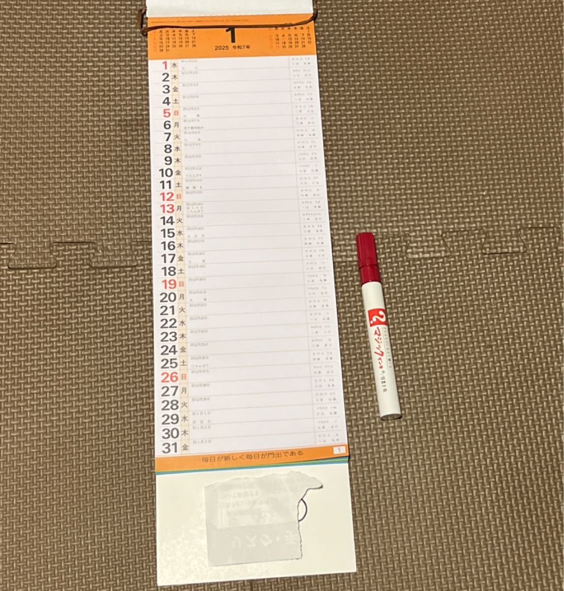小さい 壁掛けカレンダー★令和7年 2025★縦並び 六曜・旧暦 ・干支・九星・メモ欄有★シンプル 絵なし 前の月 次の月 満年齢表 吊るし紐有