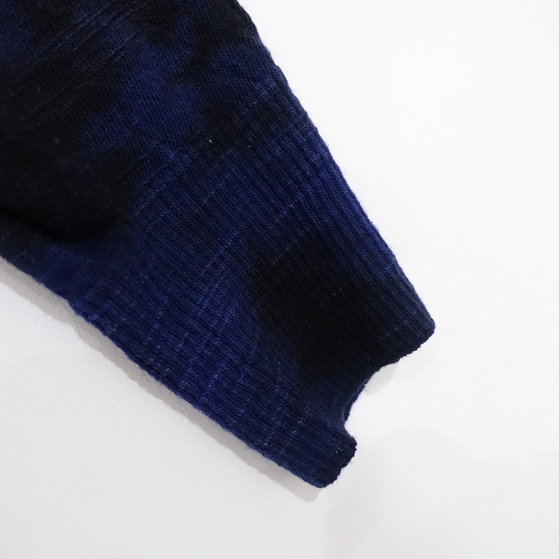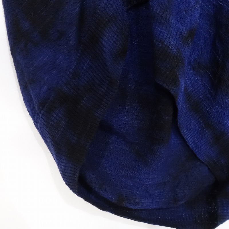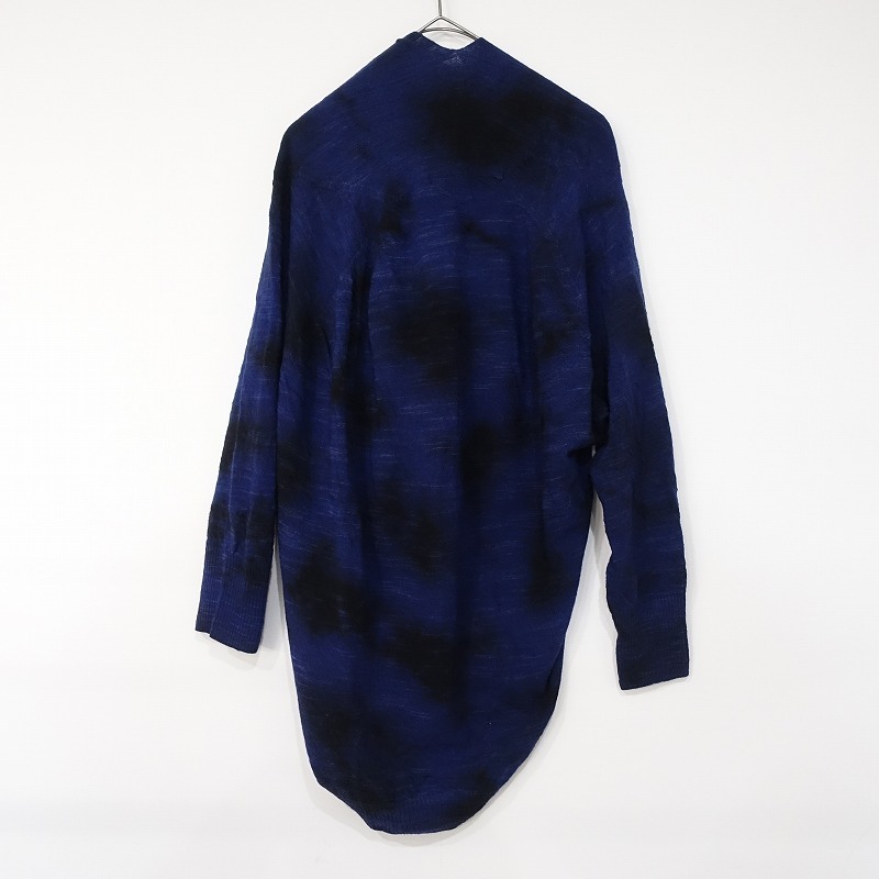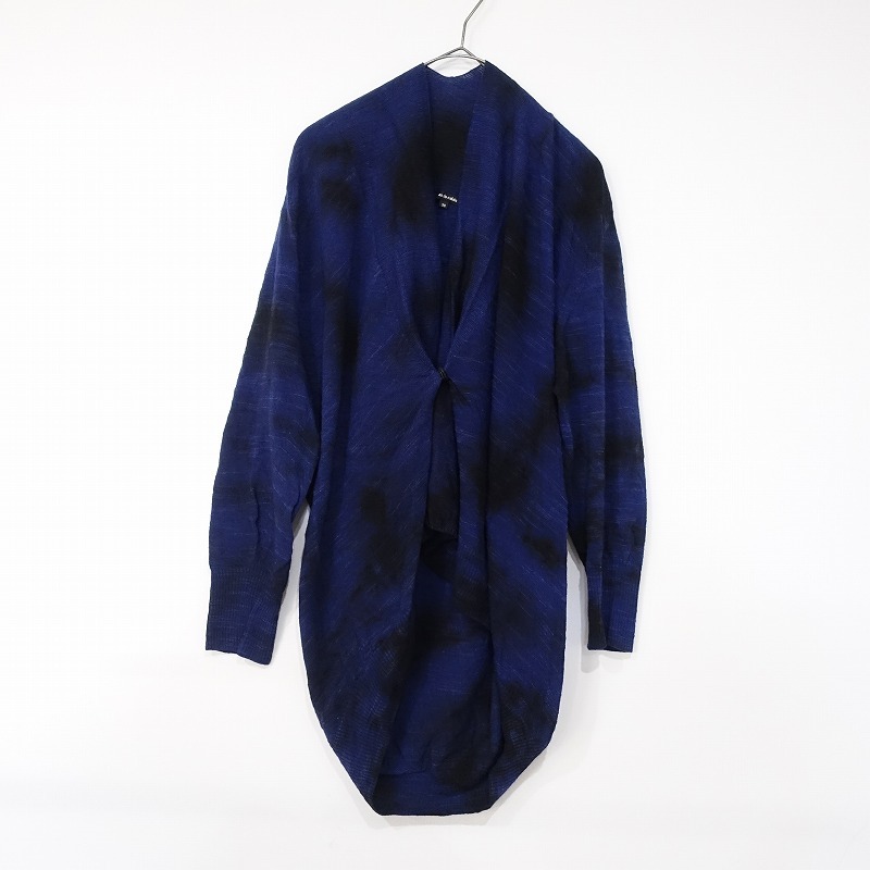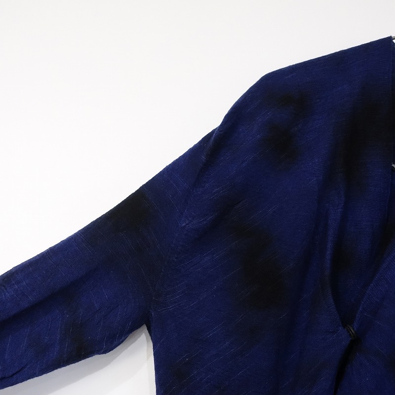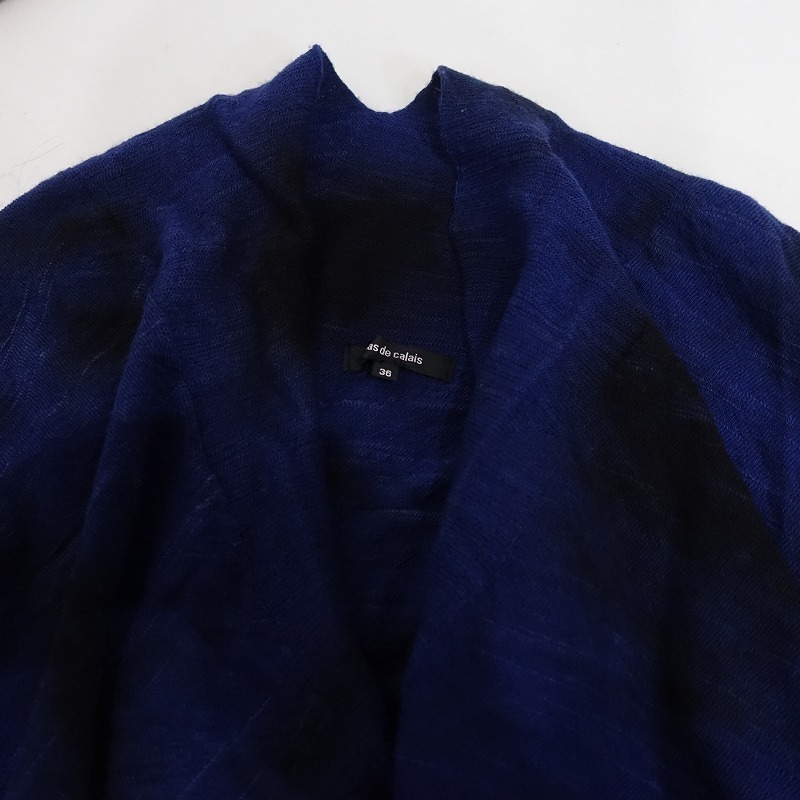 pas de calaisのムラ染めスラブ糸ホールカーディガンです。カラーはミッドナイトブルーダークネイビーのムラ染めです。糸節混じりの細いウールの糸で編まれた薄手ニットのカーディガンです。シームレスのホールガーメントで仕立てられています。フロントは1個のスナップボタン留めです。前後差があり、後ろ身頃に自然にできるドレープがポイントです。ポケットはございません。定価(メーカー希望小売価格)33,480円の商品です。