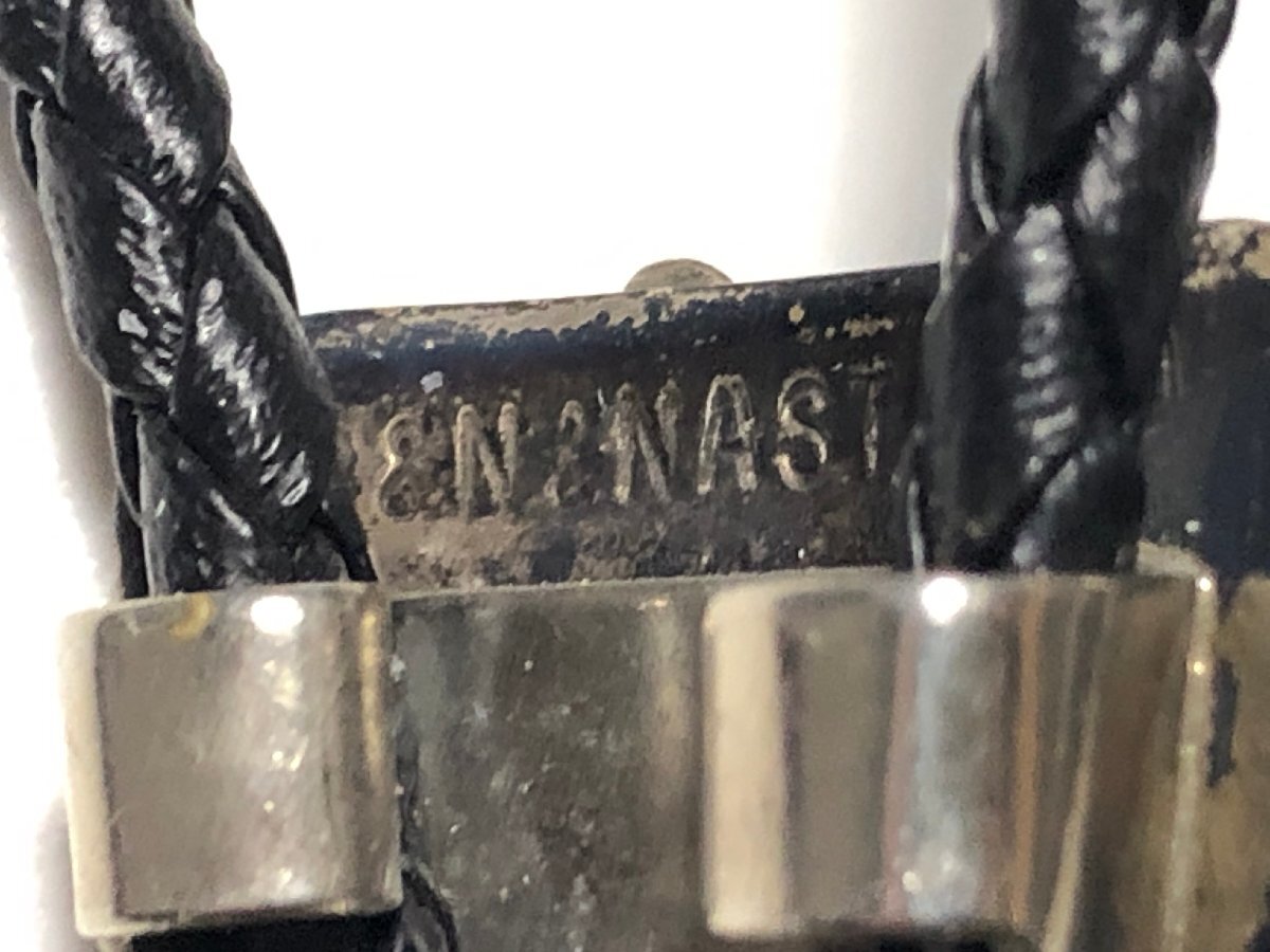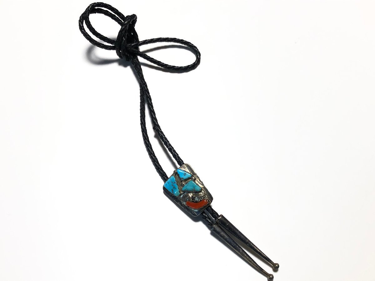 インディアンジュエリーのターコイズ、レッドコーラル、 STERLING SILVERを使用した、デザインループタイです。作者、B&N NASTACIOの刻印があります。銀部分に銀特有の変色があります。