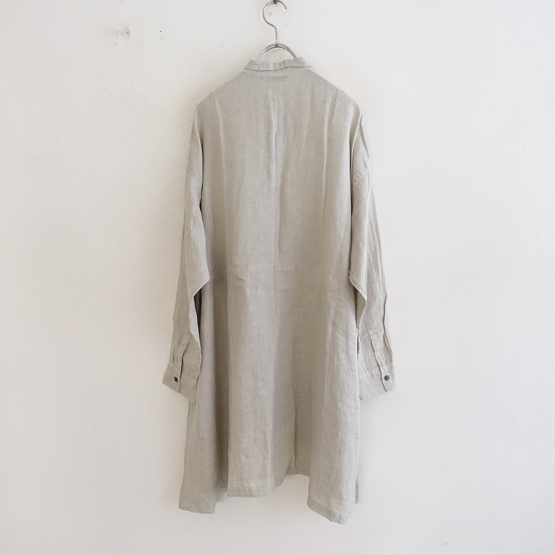 pas de calaisの60リネンブラウスです。カラーはグレージュで製品染めが施されております。細めの襟のデザインで、オーバーサイズシルエットになっており、チュニックとしてもご利用いただけるアイテムです。フロントボタン開閉で着脱でき、両サイドにシームポケットが付いております。定価(メーカー希望小売価格)31,900円 税込みの商品です。