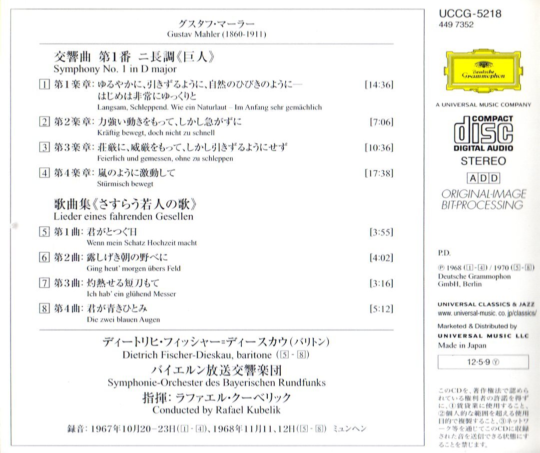 CD (即決) マーラー/ 交響曲1番「巨人」さすらう若人の詩/ ラファエル・クーベリック指揮;DF・ディースカウ他(送料シングル4枚180円)