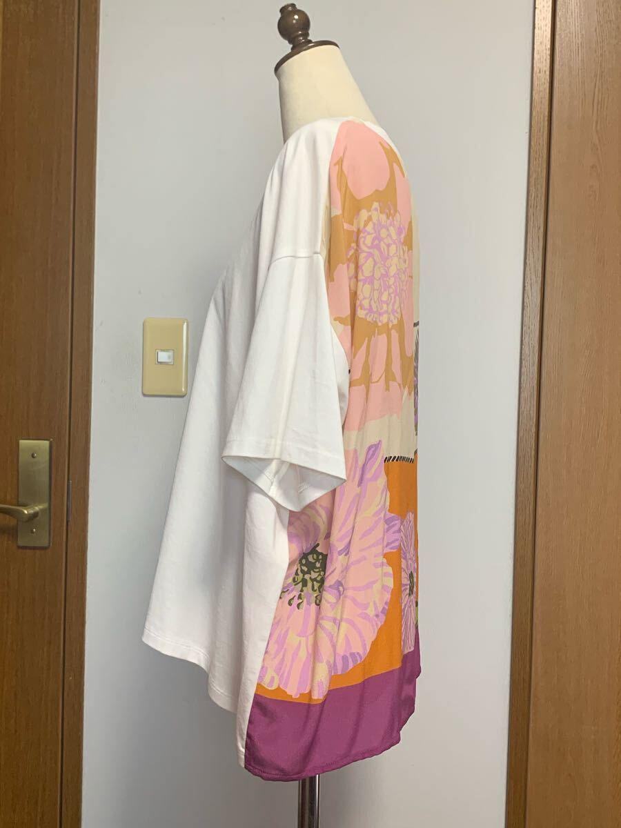 【美品】 バックプリント(シルク)が気に入り購入しました。着用のチャンスが無くしまっていましたが、クローゼット整理中のため出品する事にしました。試着のみの綺麗な状態です。タグにはSサイズの表記が有りますが、LLサイズの私でも試着出来ました。