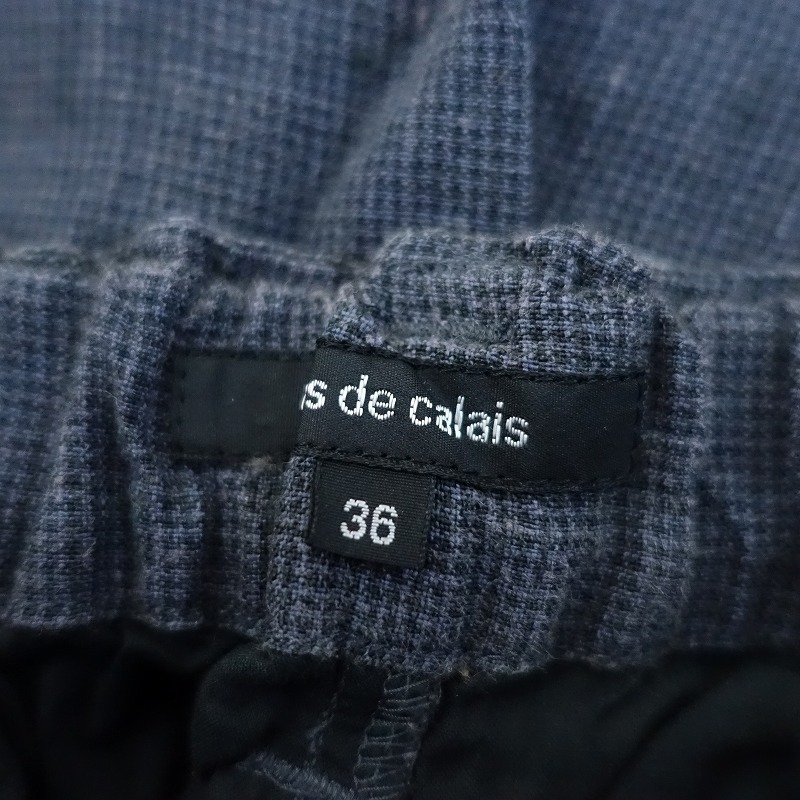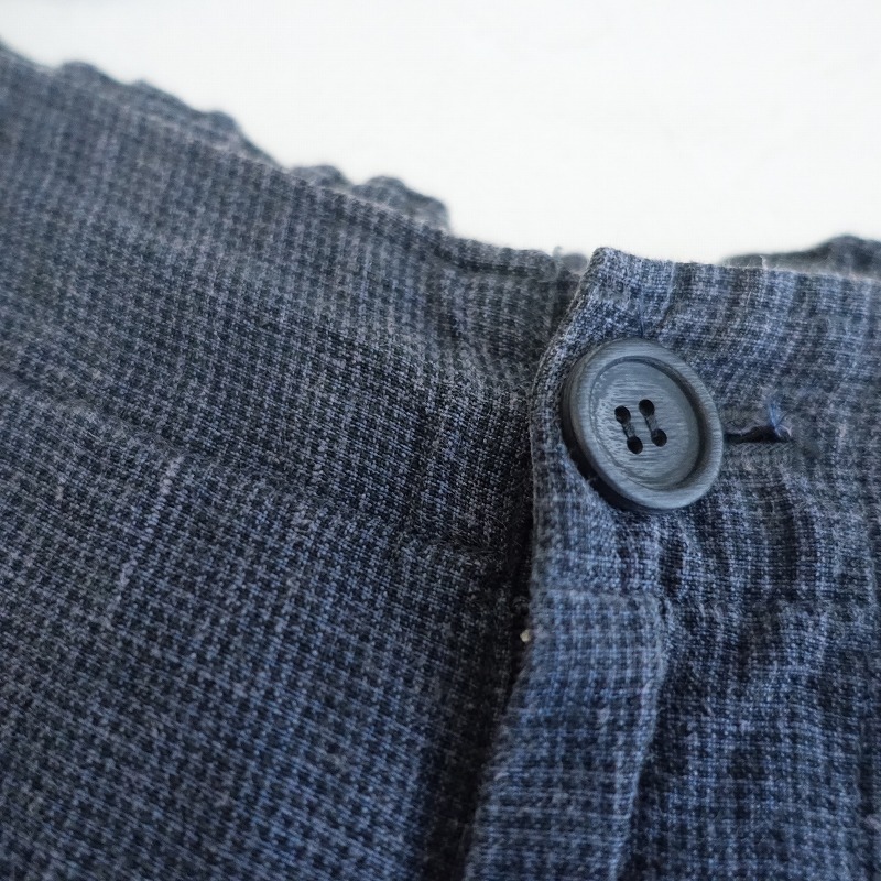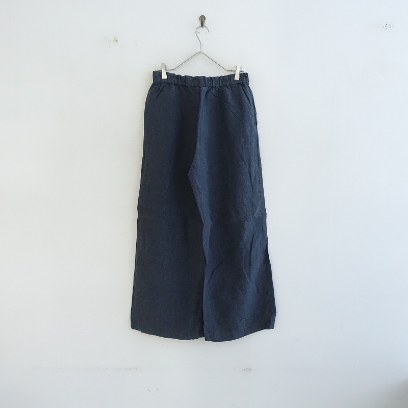 pas de calaisのリネンチェックワイドパンツです。カラーは製品染めが施されたネイビー×グレーのピンチェック柄で、ネップや織ムラのある麻素材です。ワイドデザインで、フロントのボタン&ジッパーで着脱でき、バックウエストにゴム入りです。前腰左右にポケットがあり、膝上辺りまでの裏地付きです。定価(メーカー希望小売価格)26,400円の商品です。