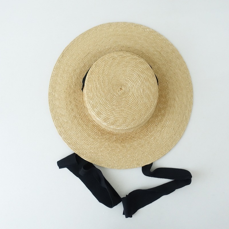 p cnqのリボン付きストローハットです。カラーはナチュラルで、天然素材(麦わら)で編まれており、両サイドに垂れる黒いリボンが印象的なデザインです。このリボンはそのまま垂らせたり、あご紐のように結んだりといろいろアレンジしていただるようになっており、定価(メーカー希望小売価格)18,700円のの商品です。