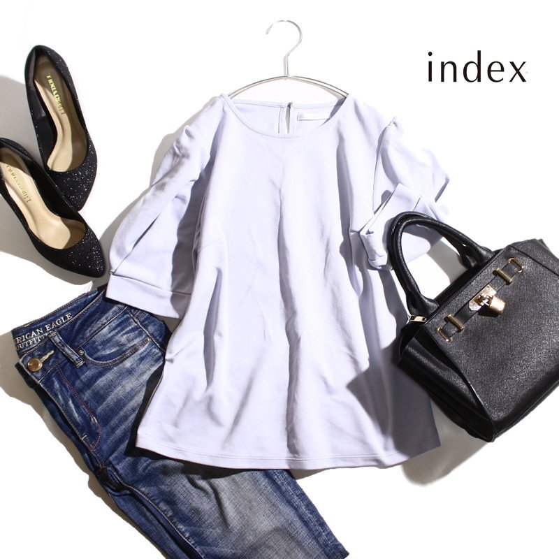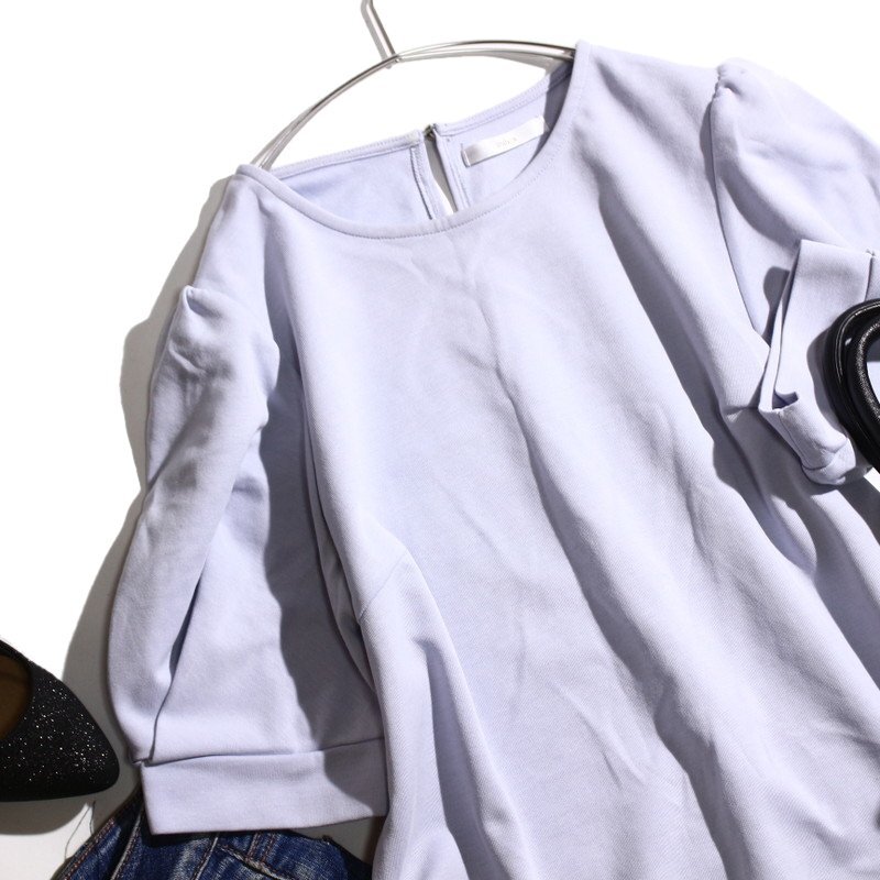 美品 index インデックス 株) ワールド 夏 ポリエステル コットン Tシャツ 素材 半袖 パフスリーブ カットソー L ライトブルー 水色 無地