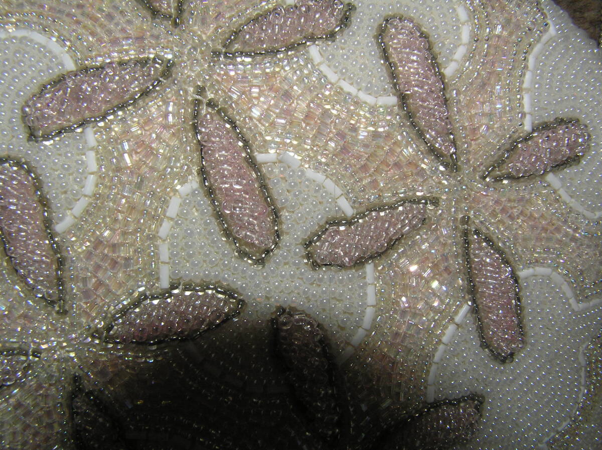 白ベースにピンクの濃淡とシルバーのビーズを用いてご覧のような可愛らしい花を刺した上品で控え目なバッグです