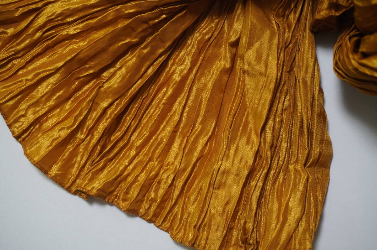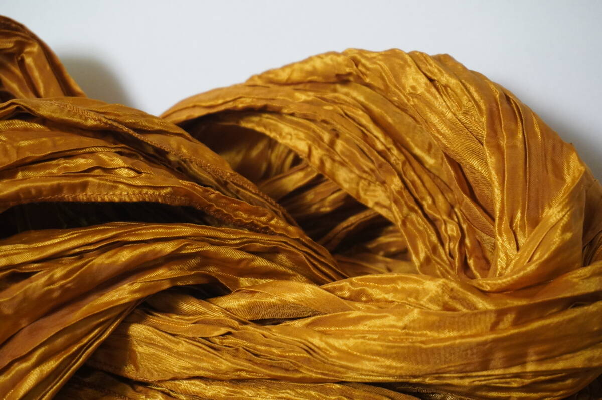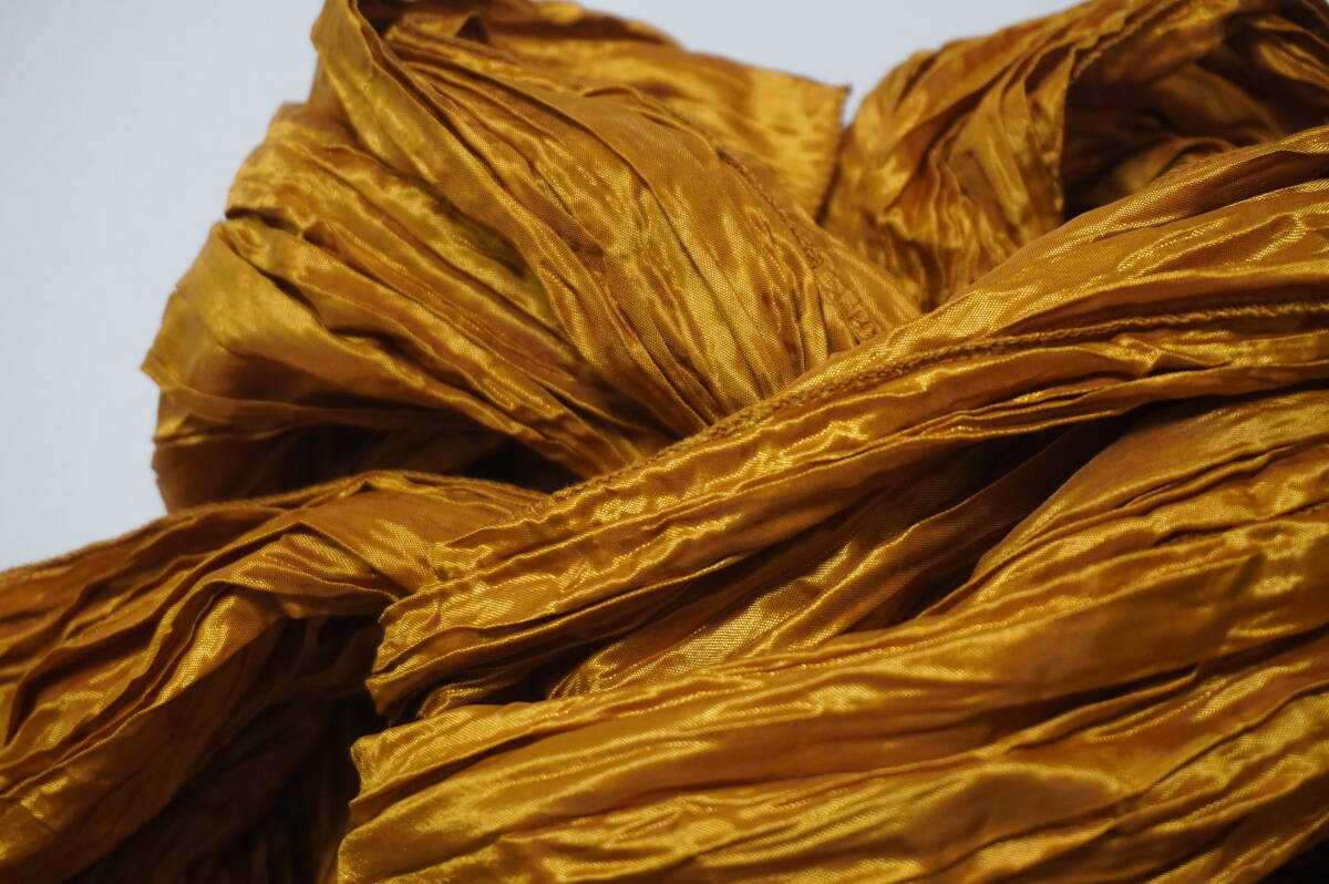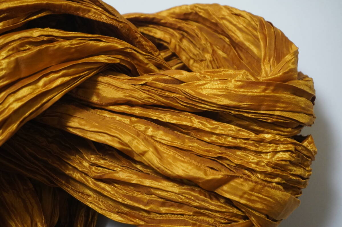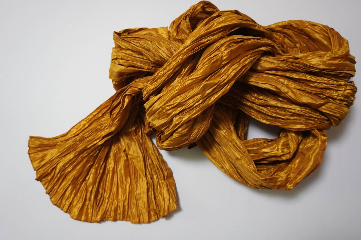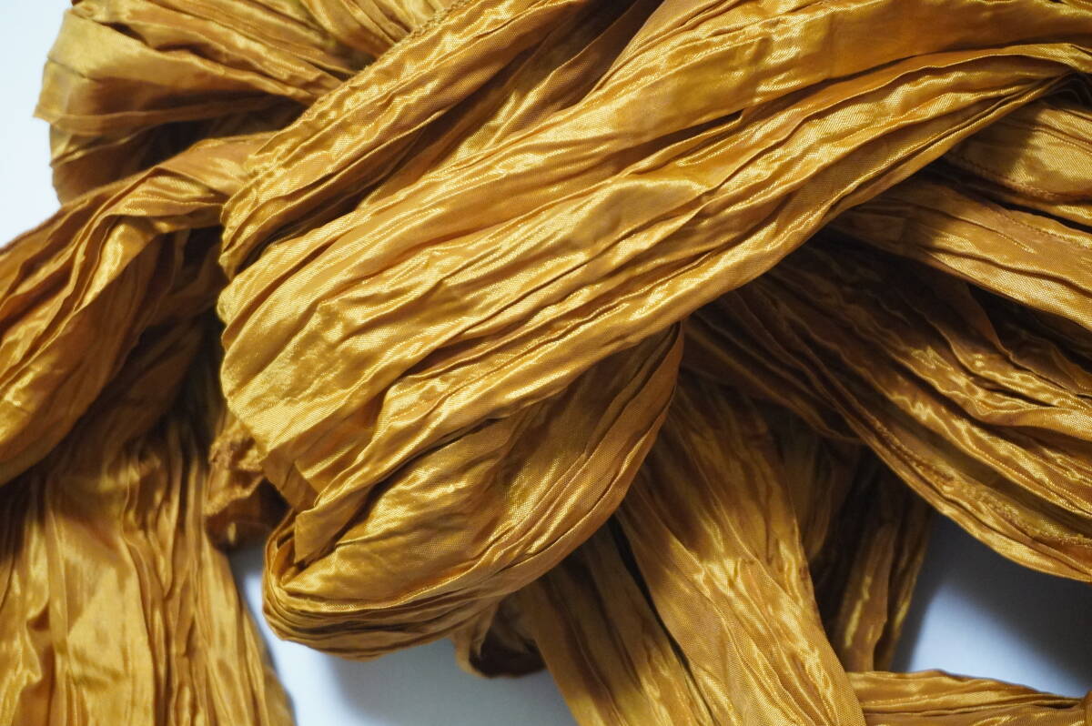ゆかた用、無地(縦しわしわ)柄へこ帯(金茶色)AB品   化繊(ポリエステル?)  約55x390cm  縦にしわしわ風になっています、両面同じ色(濃淡はありません)です。兵児帯のみです