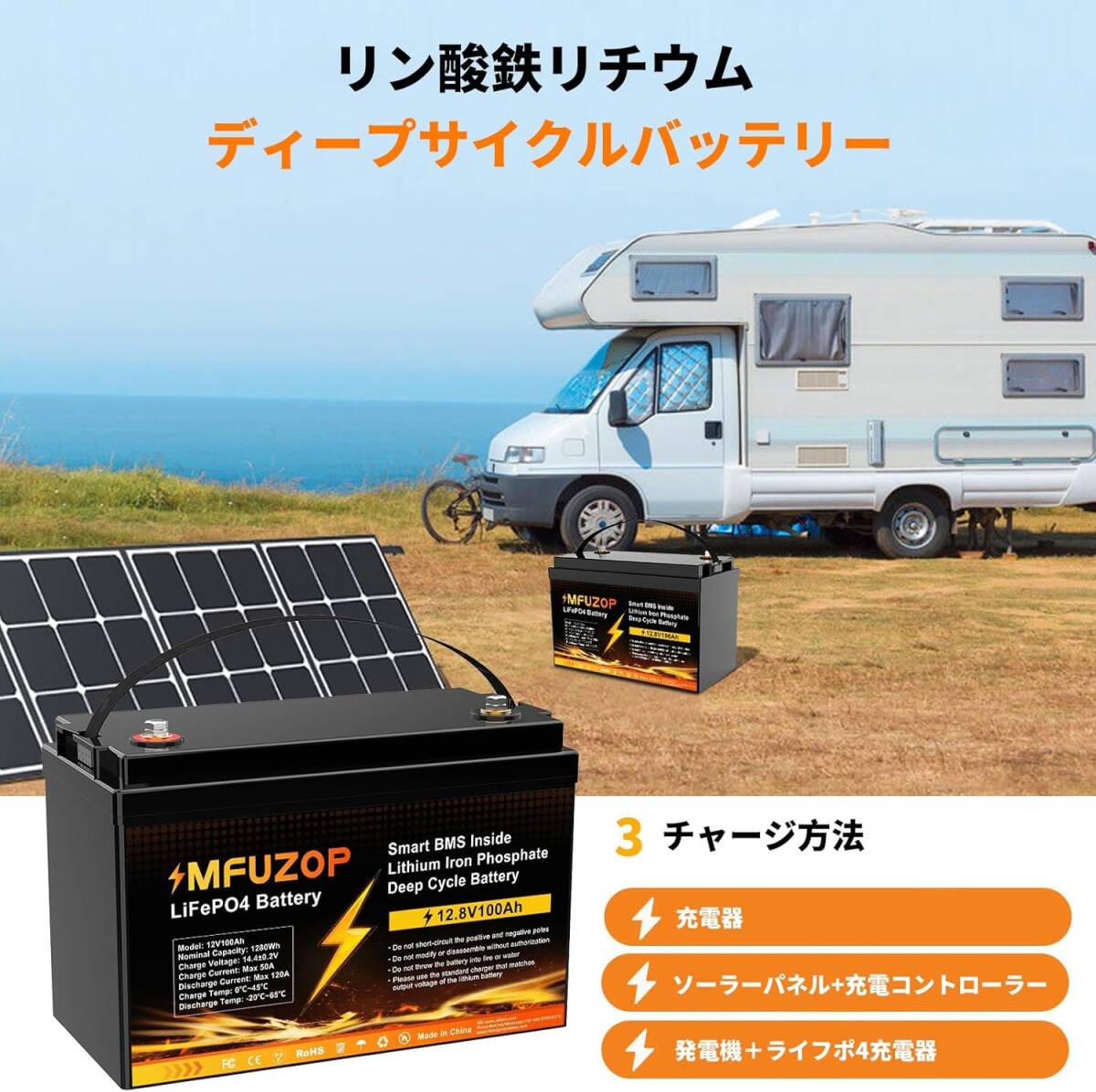 Product name: MFUZOP 12V 100Ah 12.8V LiFePO4 リン酸鉄リチウムイオンバッテリー 1280Wh 100AのBMS ソーラー発電 車中泊 家庭用蓄電