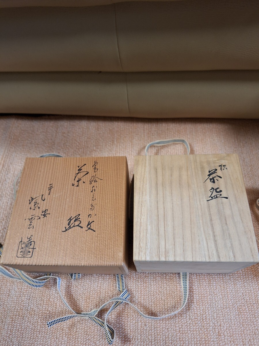 京焼、抹茶茶碗、平安紫雲、木村山花2点です。平安紫雲、口径約12cm、高さ約7、5cm、木村山花、口径約13、5cm、高さ約5、5cm、2点共箱入りです。