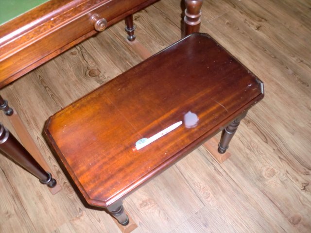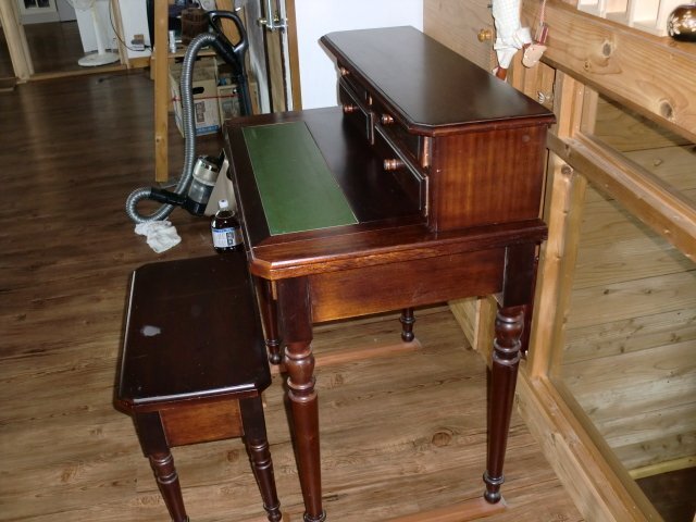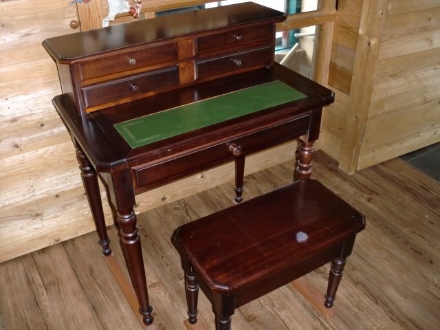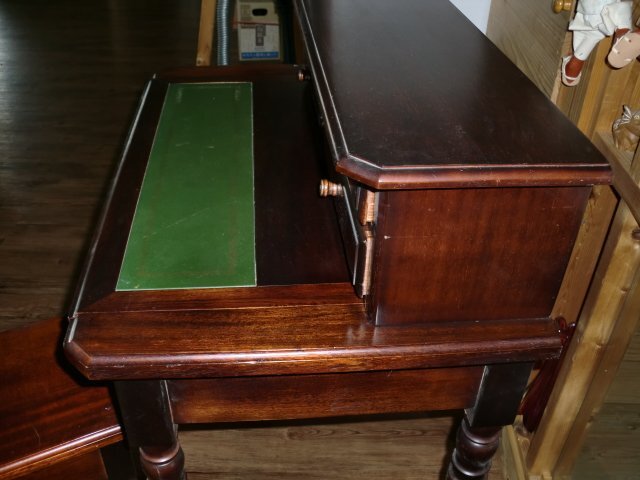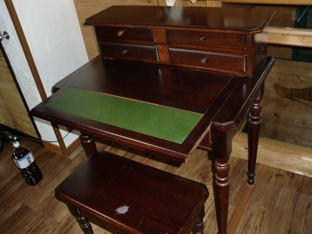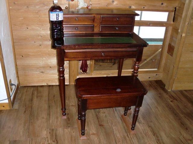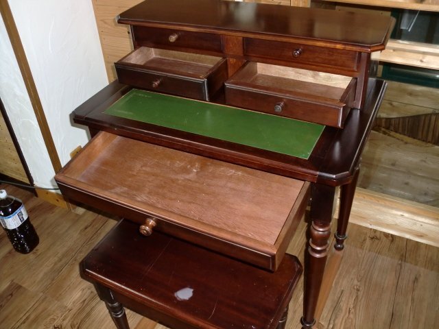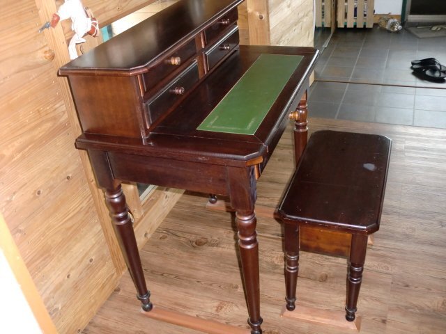 中古品の木製ライティングデスクです。祖父の家にあったものです。年式等は不明です。価格も不明ですが数万円はすると思われます。