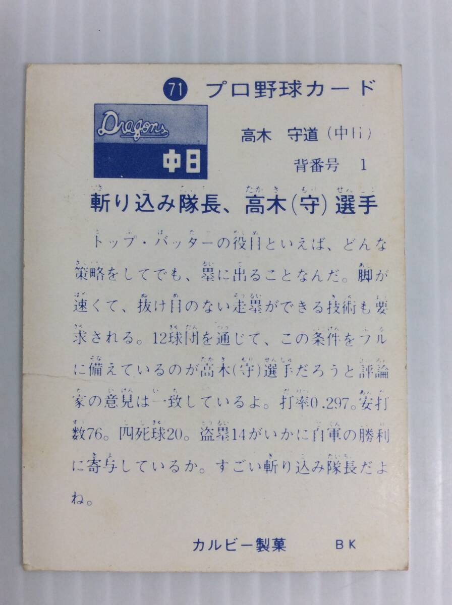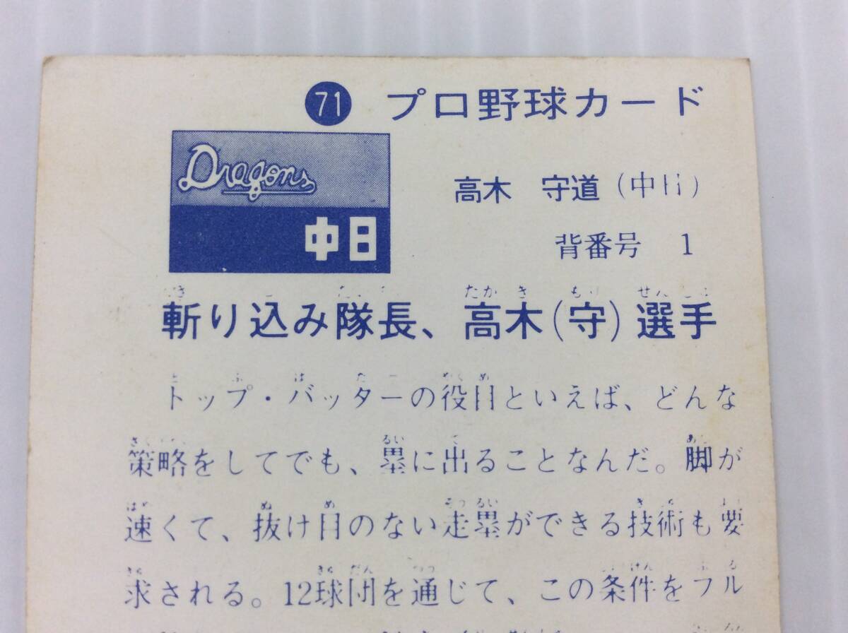 Product name: カルビー プロ野球カード No.71 高木守道「斬り込み隊長、高木(守)選手」 中日 1973年【D-04】