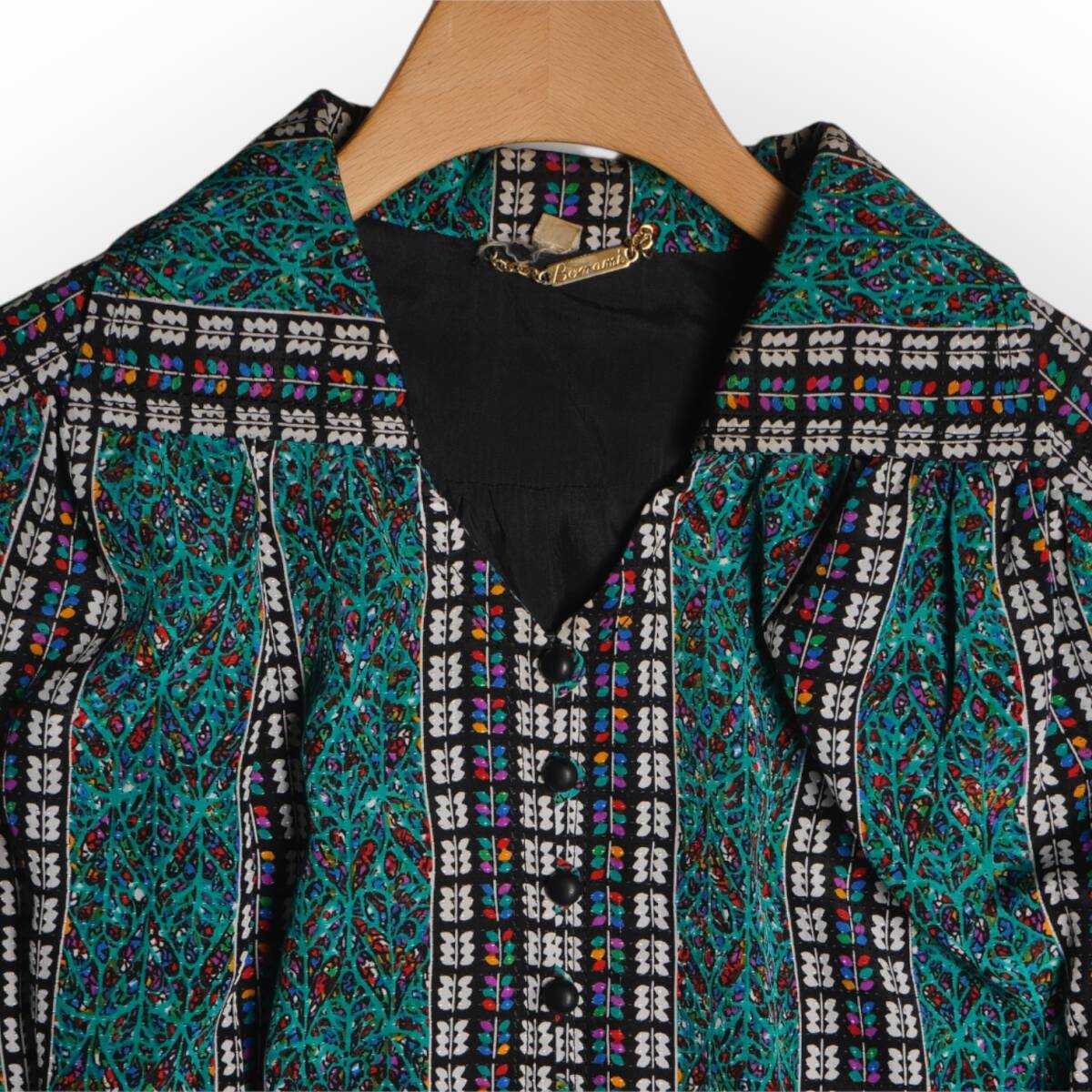 民族調の華やかなパターンが存在感を放ち、印象的なスタイルが完成します。