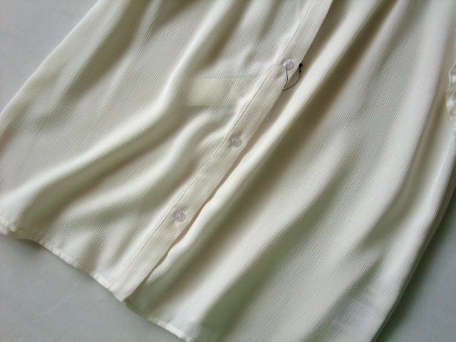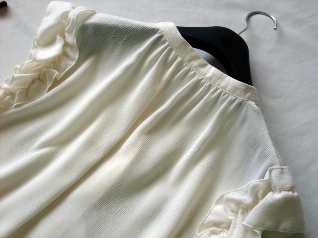 訳あり★大人可愛い★人気★涼し気楊柳素材★バンドカラVネックーフリルフレンチ袖ギャザーふんわりブラウス★Mアイボリークリーム