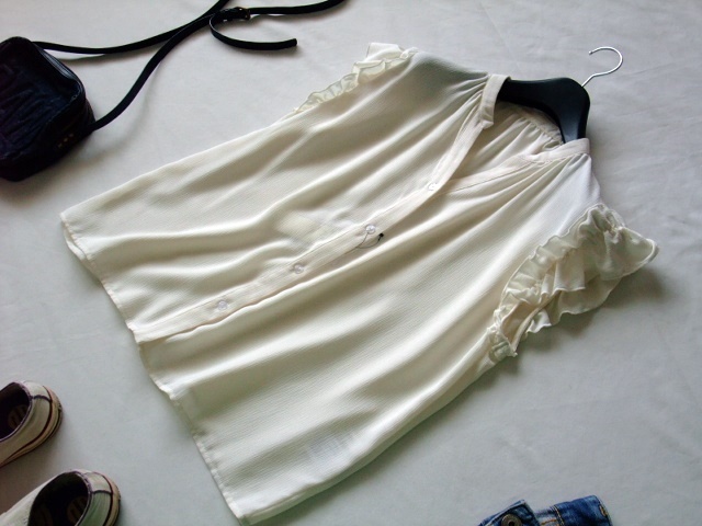 Product name: 訳あり★大人可愛い★人気★涼し気楊柳素材★バンドカラVネックーフリルフレンチ袖ギャザーふんわりブラウス★Mアイボリークリーム