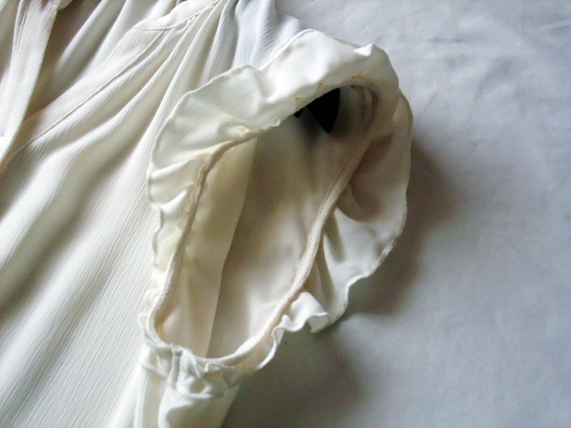 訳あり★大人可愛い★人気★涼し気楊柳素材★バンドカラVネックーフリルフレンチ袖ギャザーふんわりブラウス★Mアイボリークリーム★