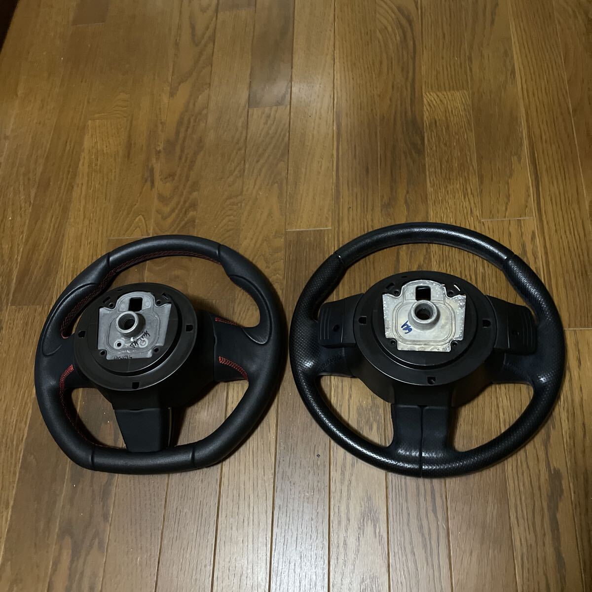 フィアットステアリングはパドルシフト仕様でダメージもそれなりです。アバルトステアリングはイタリア本国マニュアル仕様のステアリングスイッチ8つ赤ステッチタイプでシボも残って良い状態だと思います。